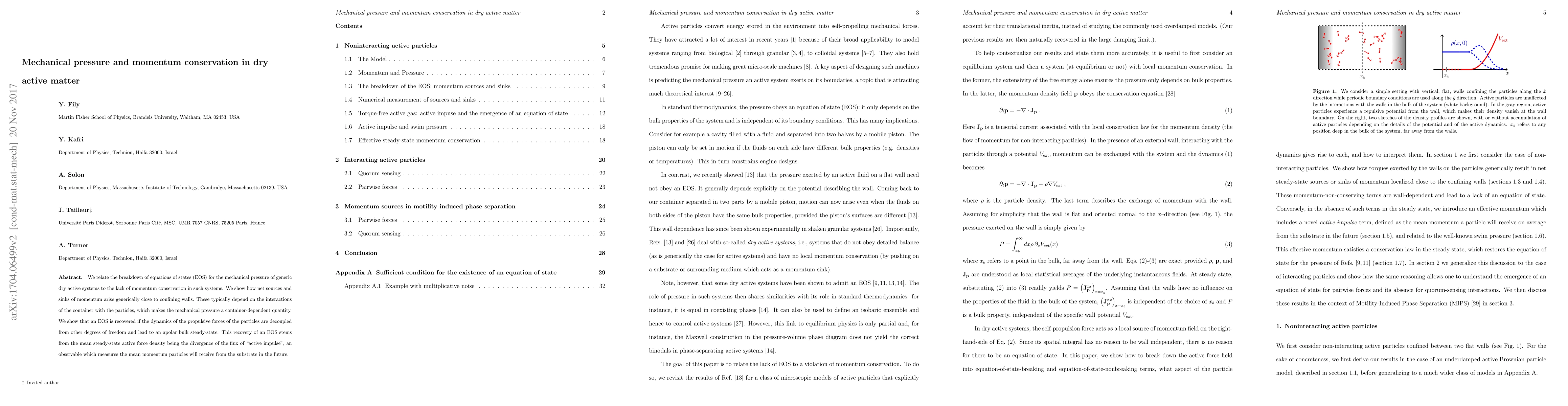 The study shows that dry active matter systems lack momentum conservation due to container-dependent interactions. An equation of state is recovered when the orientation dynamics of particles are decoupled from other degrees of freedom.
