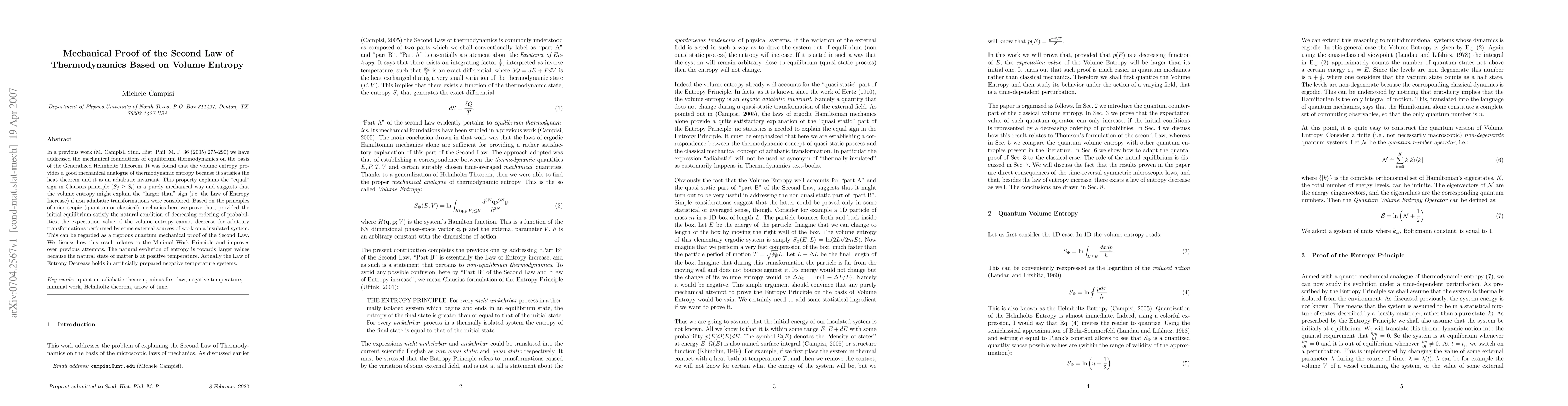 This paper provides a mechanical proof of the Second Law of Thermodynamics using volume entropy as a mechanical analogue. It demonstrates that the expectation value of volume entropy cannot decrease in insulated systems, thus rigorously proving the Second Law in quantum mechanics, and relates this to the Minimal Work Principle.