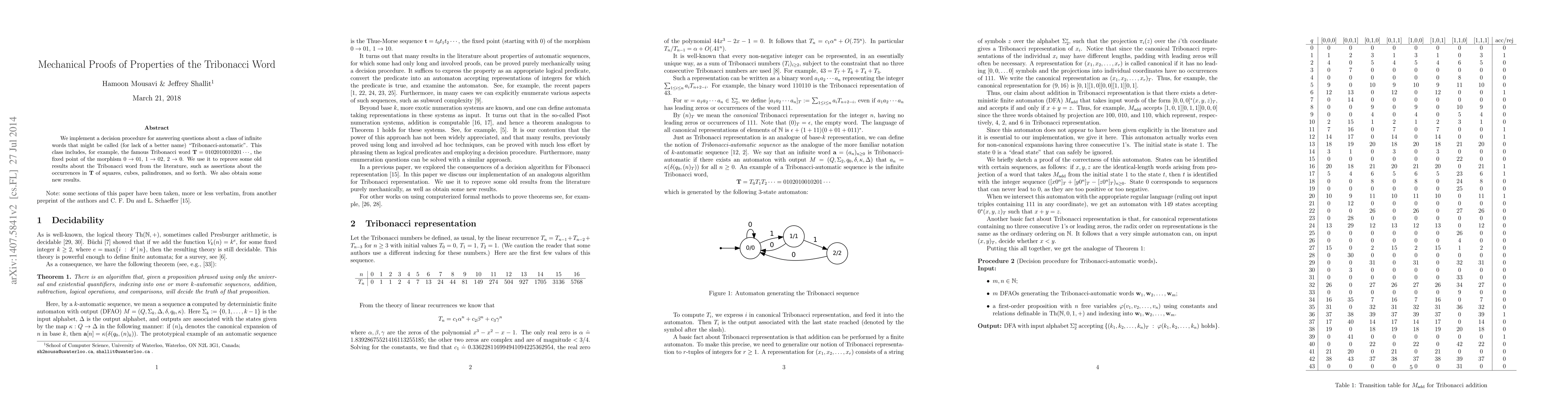 We implement a decision procedure for answering questions about a class of infinite words that might be called (for lack of a better name) "Tribonacci-automatic". This class includes, for example, the famous Tribonacci word T = 0102010010202 ..., the fixed point of the morphism 0 -> 01, 1 -> 02, 2 -> 0. We use it to reprove some old results about the Tribonacci word from the literature, such as assertions about the occurrences in T of squares, cubes, palindromes, and so forth. We also obtain some new results.
