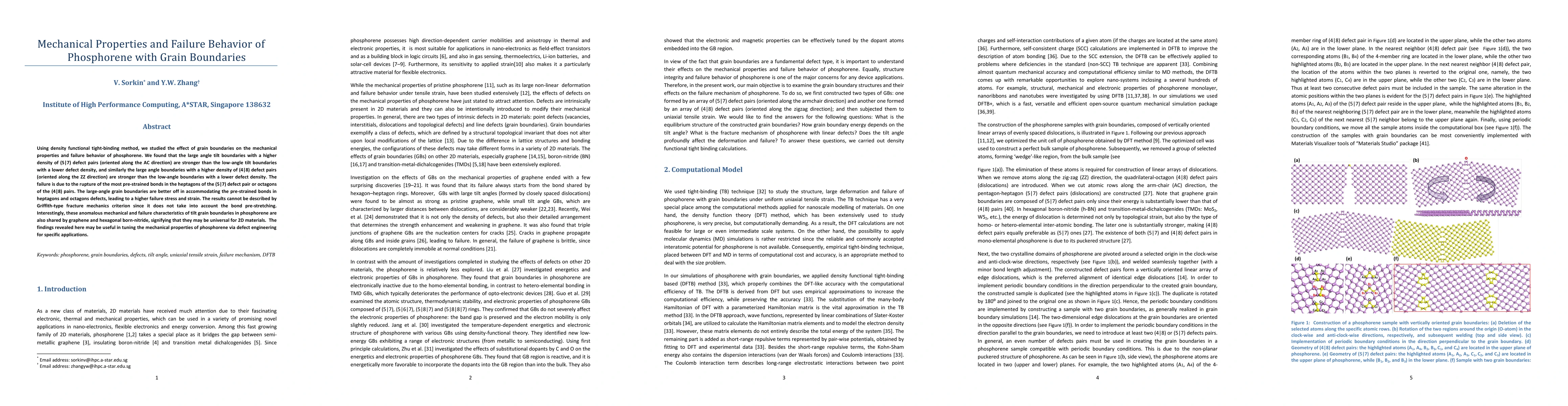 This study reveals that large-angle tilt grain boundaries in phosphorene, characterized by higher defect densities, exhibit superior mechanical strength compared to low-angle boundaries. The failure mechanism involves rupture of pre-strained bonds in specific defect pairs, and these findings suggest a universal trend in 2D materials.