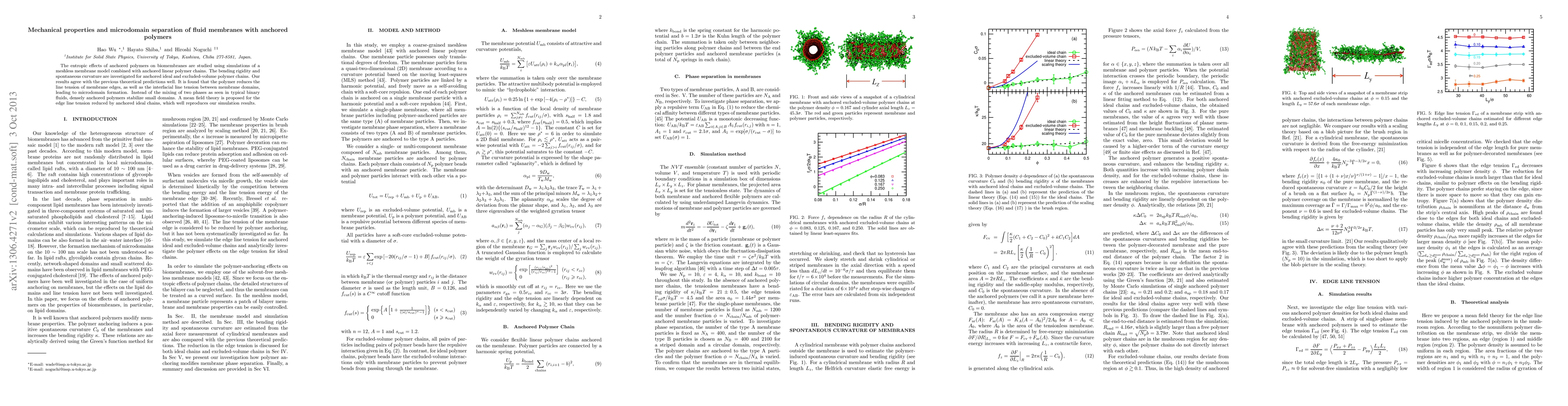 This paper investigates the mechanical properties of fluid membranes with anchored polymers using simulations and finds that these polymers reduce membrane edge tension and stabilize microdomains, leading to distinct phase separation instead of typical binary fluid mixing. A mean field theory is proposed to explain the reduced edge line tension by anchored polymer chains.