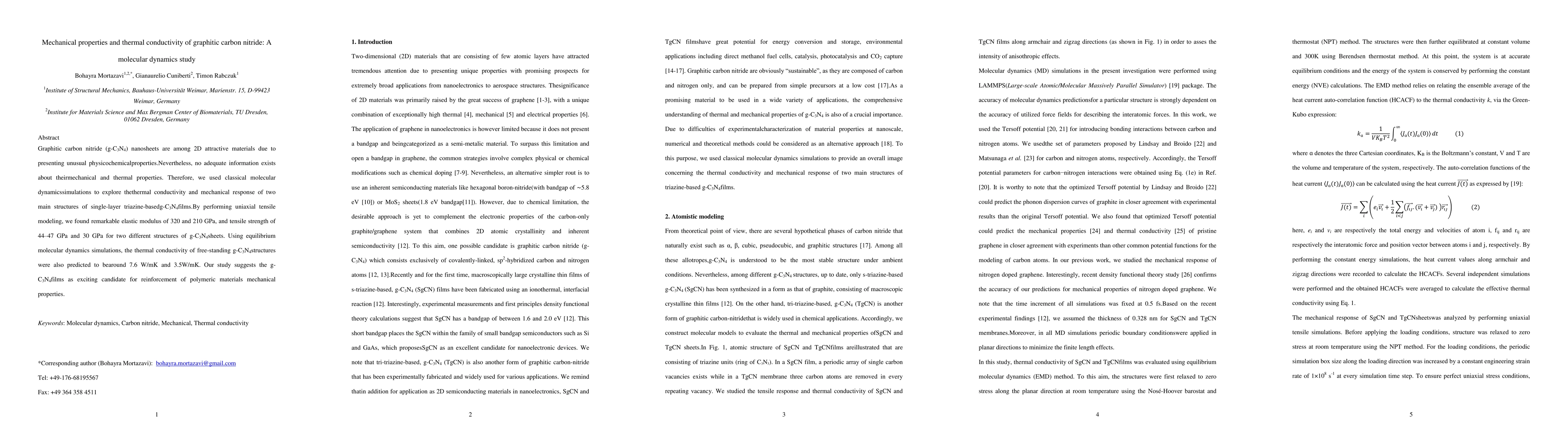 Graphitic carbon nitride nanosheets are among 2D attractive materials due to presenting unusual physicochemical properties.Nevertheless, no adequate information exists about their mechanical and thermal properties. Therefore, we used classical molecular dynamics simulations to explore the thermal conductivity and mechanical response of two main structures of single-layer triazine-basedg-C3N4 films.By performing uniaxial tensile modeling, we found remarkable elastic modulus of 320 and 210 GPa, and tensile strength of 47 GPa and 30 GPa for two different structures of g-C3N4sheets. Using equilibrium molecular dynamics simulations, the thermal conductivity of free-standing g-C3N4 structures were also predicted to be around 7.6 W/mK and 3.5 W/mK. Our study suggests the g-C3N4films as exciting candidate for reinforcement of polymeric materials mechanical properties.