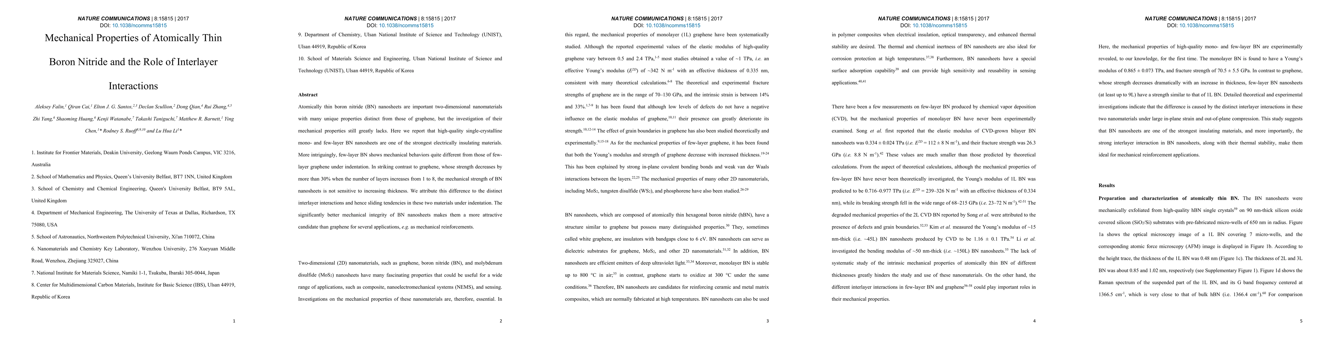 This study finds that atomically thin boron nitride nanosheets are one of the strongest electrically insulating materials, with mechanical strength unaffected by increasing thickness due to distinct interlayer interactions. Unlike graphene, BN maintains strength across layers, making it a superior candidate for mechanical reinforcement applications.