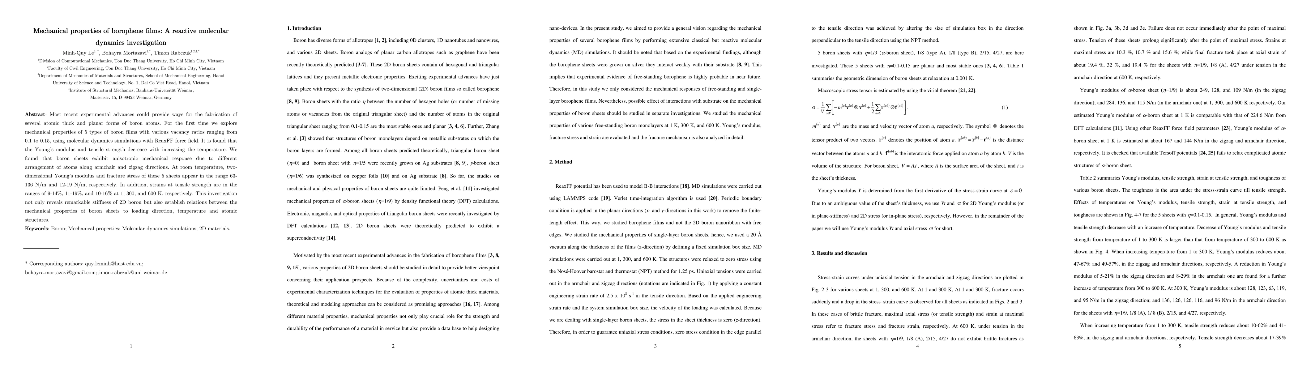 This study investigates the mechanical properties of five types of boron films using reactive molecular dynamics simulations. The findings show that boron sheets exhibit anisotropic mechanical behavior, with Young's modulus and tensile strength decreasing with temperature, and the mechanical properties are influenced by the atomic arrangement and loading direction.