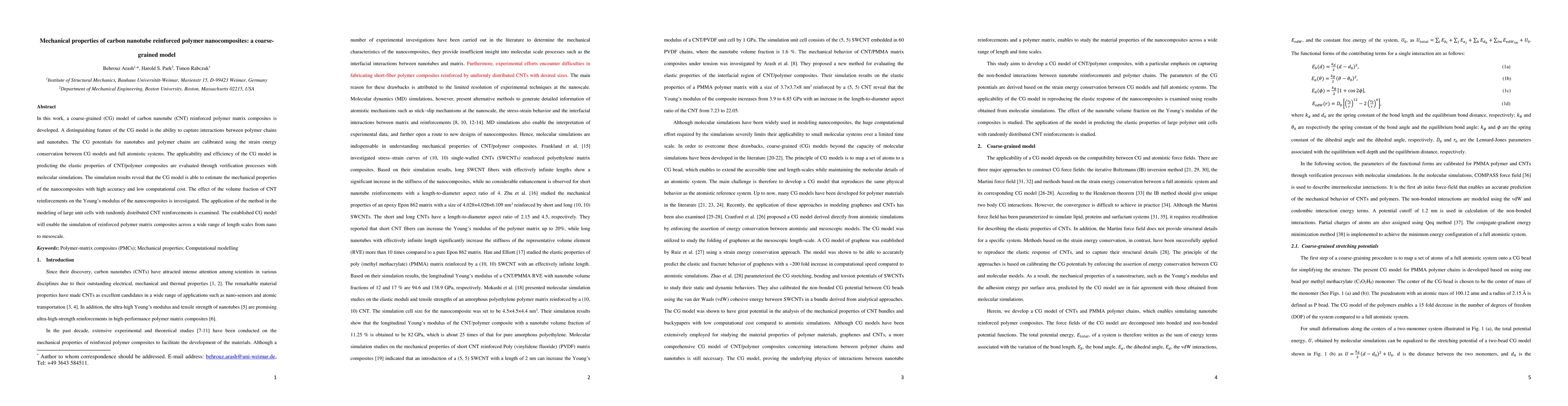 This research develops a coarse-grained model to simulate carbon nanotube reinforced polymer nanocomposites, capturing interactions between polymer chains and nanotubes. The model accurately predicts the nanocomposites' elastic properties with lower computational costs, and investigates the impact of CNT volume fraction on the Young's modulus.