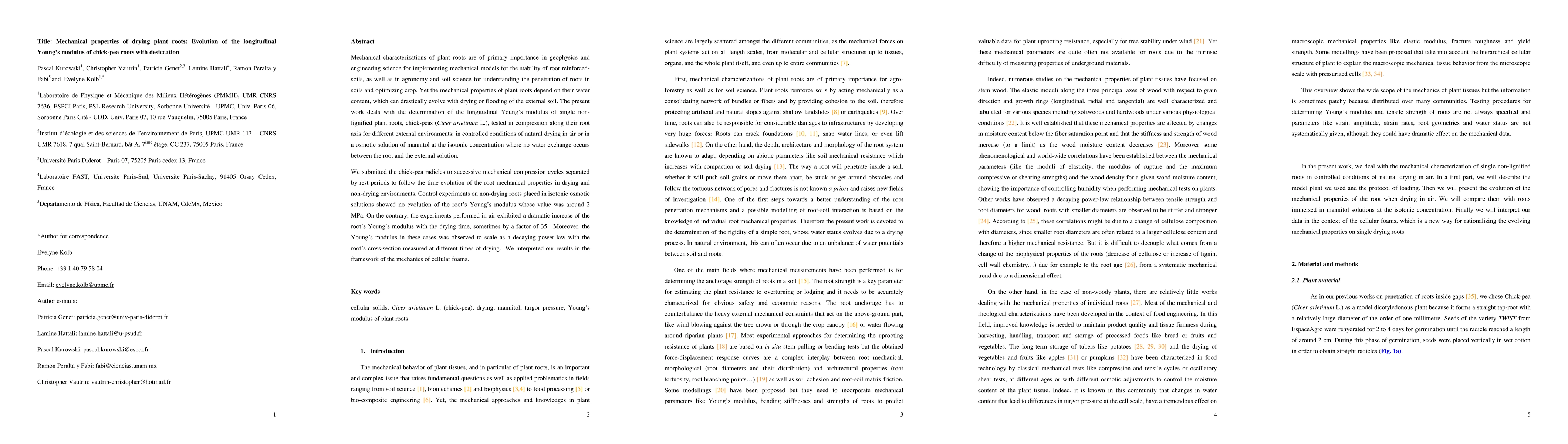 Mechanical characterizations of plant roots are of primary importance in geophysics and engineering science for implementing mechanical models for the stability of root reinforced-soils, as well as in agronomy and soil science for understanding the penetration of roots in soils and optimizing crop. Yet the mechanical properties of plant roots depend on their water content, which can drastically evolve with drying or flooding of the external soil. The present work deals with the determination of the longitudinal Young's modulus of single non-lignified plant roots, chick-peas (Cicer arietinum L.), tested in compression along their root axis for different external environments: in controlled conditions of natural drying in air or in a osmotic solution of mannitol at the isotonic concentration where no water exchange occurs between the root and the external solution. We submitted the chick-pea radicles to successive mechanical compression cycles separated by rest periods to follow the time evolution of the root mechanical properties in drying and non-drying environments. Control experiments on non-drying roots placed in isotonic osmotic solutions showed no evolution of the root's Young's modulus whose value was around 2 MPa. On the contrary, the experiments performed in air exhibited a dramatic increase of the root's Young's modulus with the drying time, sometimes by a factor of 35. Moreover, the Young's modulus in these cases was observed to scale as a decaying power-law with the root's cross section measured at diffrent times of drying. We interpreted our results in the framework of the mechanics of cellular foams.