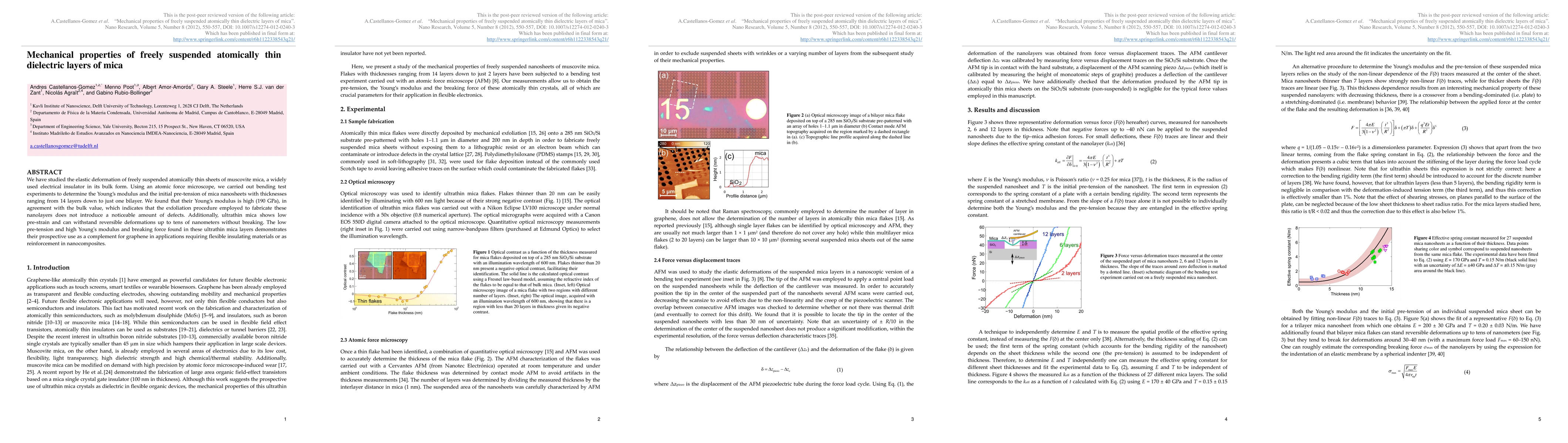 This study investigates the mechanical properties of freely suspended atomically thin mica nanosheets, finding a high Young's modulus (190 GPa) and low pre-tension, indicating potential applications as flexible insulating materials or reinforcements in nanocomposites.