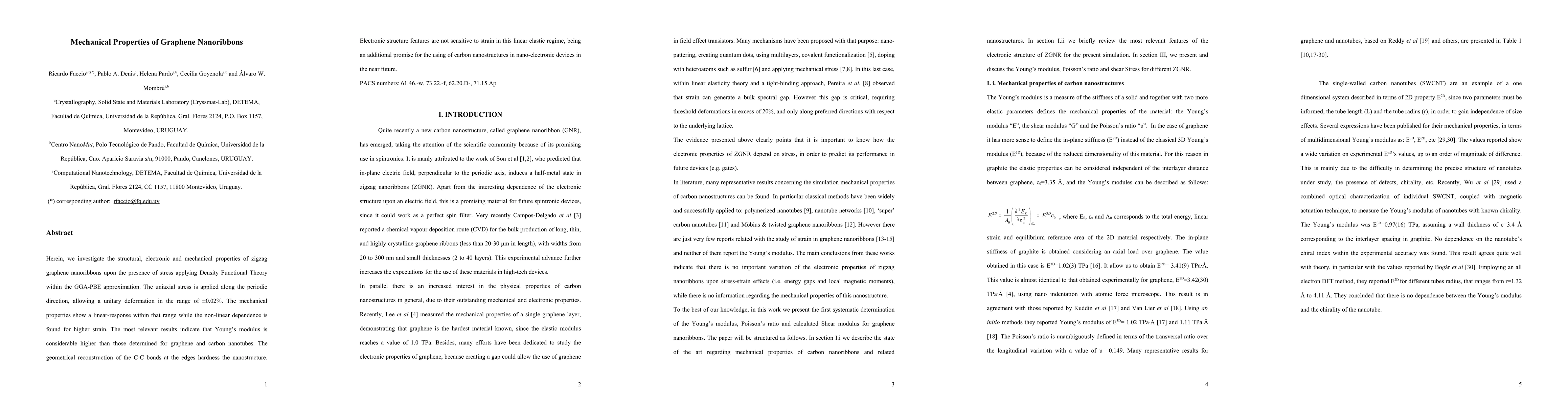 This study investigates the mechanical properties of zigzag graphene nanoribbons under uniaxial stress using Density Functional Theory. The results show a linear mechanical response within a small strain range, with a notably higher Young's modulus compared to graphene and carbon nanotubes, suggesting potential for use in nano-electronic devices.