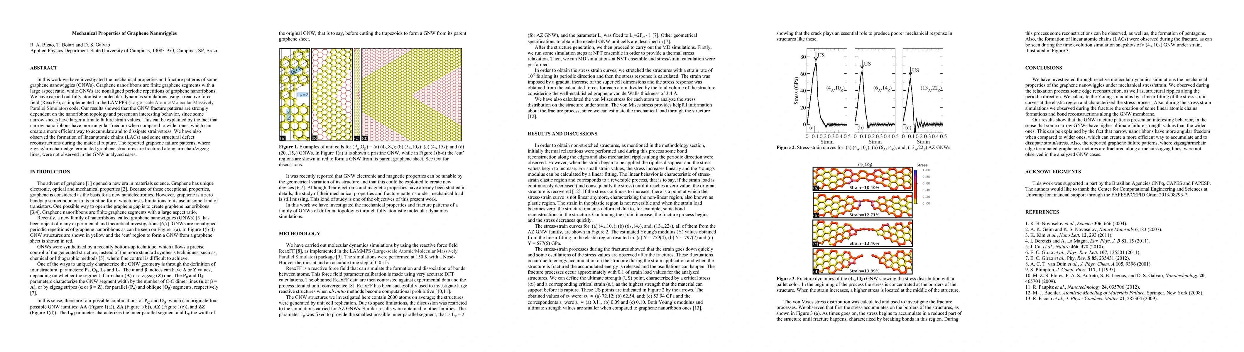 This study investigates the mechanical properties and fracture patterns of graphene nanowiggles (GNWs) using atomistic molecular dynamics simulations. The results reveal that GNWs exhibit unique fracture behaviors dependent on nanoribbon topology, with narrow sheets showing higher ultimate failure strains due to greater angular freedom.
