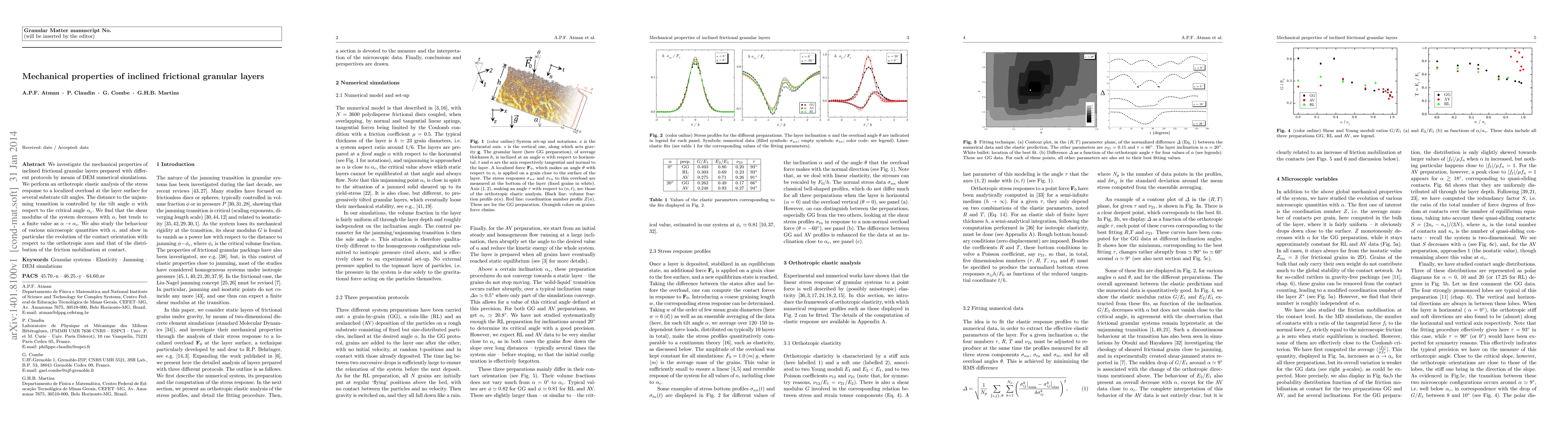 This study uses DEM simulations to analyze the mechanical properties of inclined frictional granular layers, finding that the shear modulus decreases with increasing tilt angle but stabilizes near the critical angle. It also examines the evolution of contact orientation and friction mobilization distribution with tilt angle.