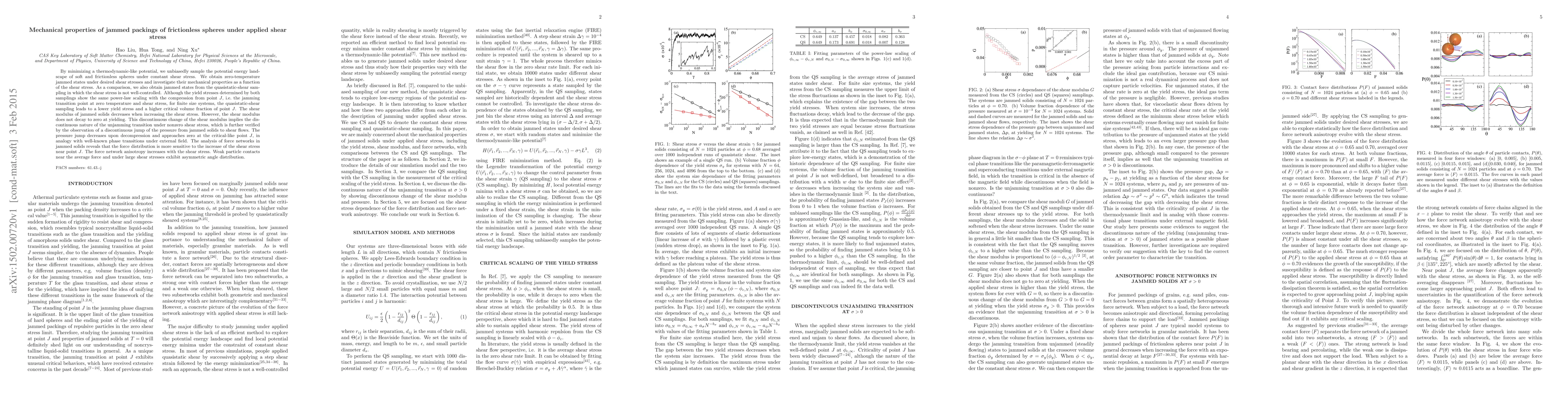 By minimizing a thermodynamic-like potential, we unbiasedly sample the potential energy landscape of soft and frictionless spheres under constant shear stress. We obtain zero-temperature jammed states under desired shear stresses and investigate their mechanical properties as a function of the shear stress. As a comparison, we also obtain jammed states from the quasistatic-shear sampling in which the shear stress is not well-controlled. Although the yield stresses determined by both samplings show the same power-law scaling with the compression from point $J$, i.e.~the jamming transition point at zero temperature and shear stress, for finite size systems, the quasistatic-shear sampling leads to a lower yield stress and a higher critical volume fraction of point $J$. The shear modulus of jammed solids decreases when increasing the shear stress. However, the shear modulus does not decay to zero at yielding. This discontinuous change of the shear modulus implies the discontinuous nature of the unjamming transition under nonzero shear stress, which is further verified by the observation of a discontinuous jump of the pressure from jammed solids to shear flows. The pressure jump decreases upon decompression and approaches zero at the critical-like point $J$, in analogy with well-known phase transitions under external field. The analysis of force networks in jammed solids reveals that the force distribution is more sensitive to the increase of the shear stress near point $J$. The force network anisotropy increases with the shear stress. Weak particle contacts near the average force and under large shear stresses exhibit asymmetric angle distribution.