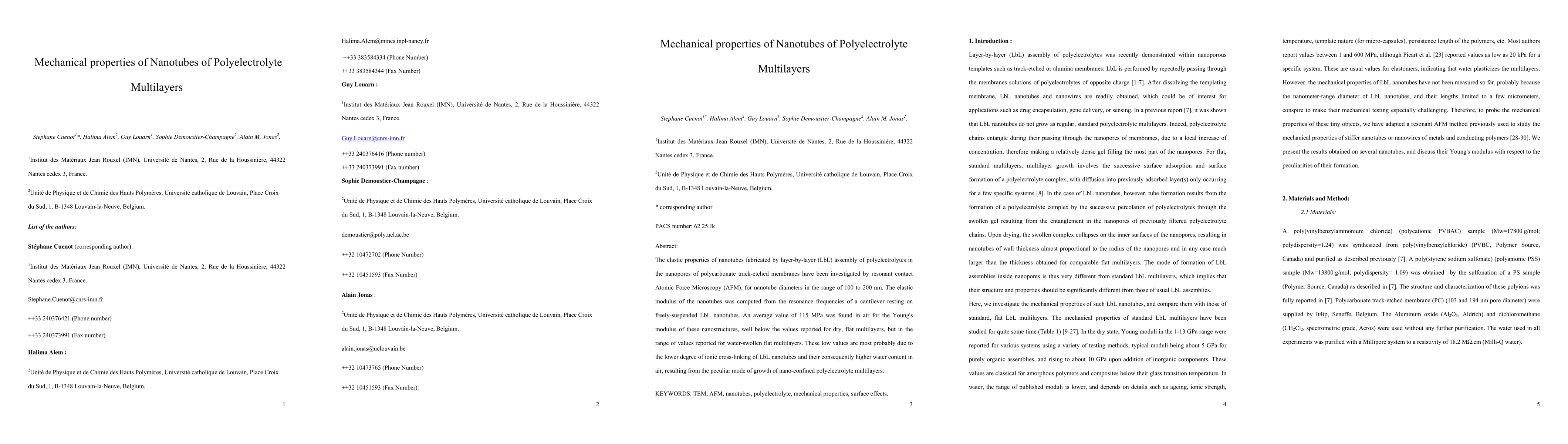 This study investigates the elastic properties of polyelectrolyte multilayer nanotubes using resonant contact Atomic Force Microscopy, finding an average Young's modulus of 115 MPa, significantly lower than dry, flat multilayers but comparable to water-swollen ones, attributed to higher water content due to lower ionic cross-linking.