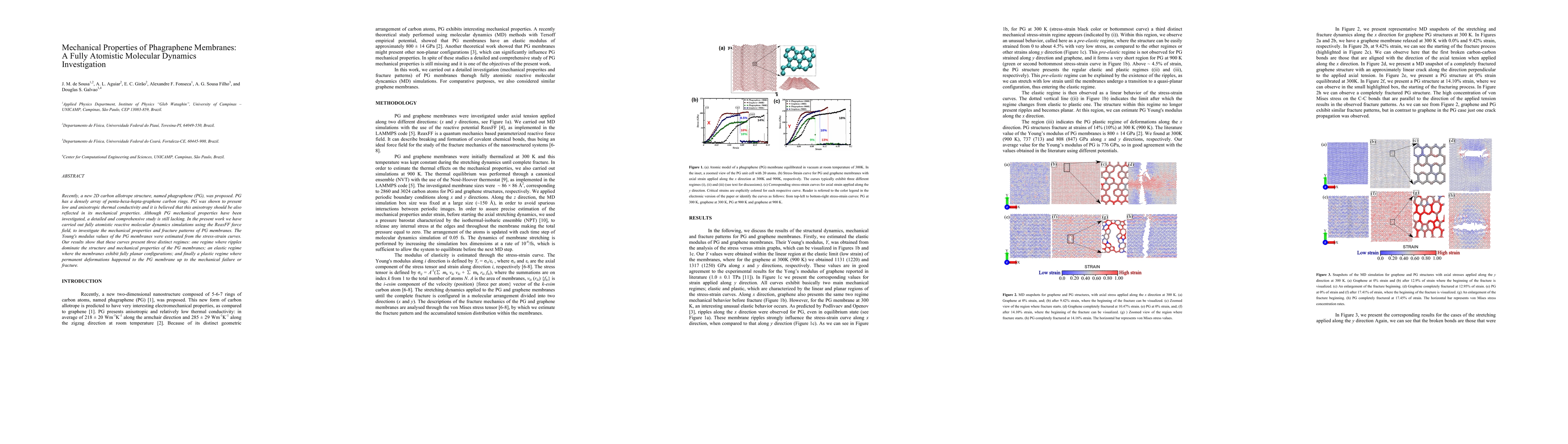 This paper investigates the mechanical properties of phagraphene membranes using atomistic molecular dynamics simulations. The study reveals three distinct stress-strain regimes: a ripple-dominated regime, an elastic regime with planar configurations, and a plastic regime leading to fracture, highlighting the material's anisotropic mechanical behavior.