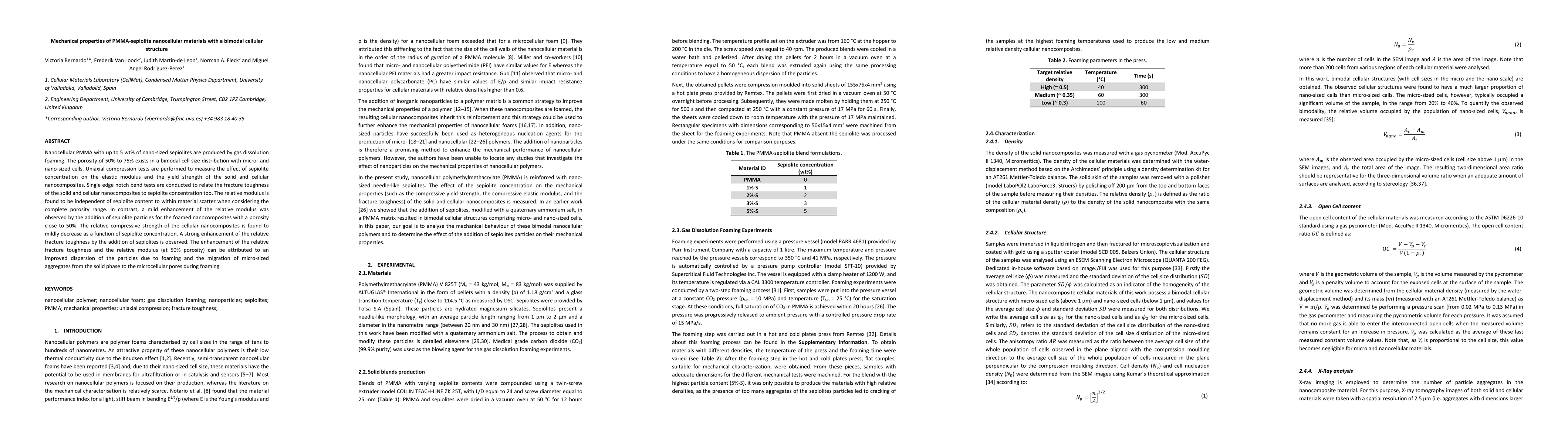 Bimodal cellular poly(methyl methacrylate) with micron and nano sized (300 to 500 nm) cells with up to 5 weight percent of sepiolite nanoparticles and porosity from 50 weight percent to 75 weight percent are produced by solid state foaming. Uniaxial compression tests are performed to measure the effect of sepiolite concentration on the elastic modulus and the yield strength of the solid and cellular nanocomposites. Single edge notch bend tests are conducted to relate the fracture toughness of the solid and cellular nanocomposites to sepiolite concentration. The relative modulus is independent of sepiolite content to within material scatter when considering the complete porosity range. In contrast, a mild enhancement of the relative modulus is observed by the addition of sepiolite particles for the foamed nanocomposites with a porosity close to 50 percent. The relative compressive strength of the cellular nanocomposites mildly decreases as a function of sepiolite concentration. A strong enhancement of the relative fracture toughness by the addition of sepiolites is observed. The enhancement of the relative fracture toughness and the relative modulus (at 50 percent porosity) can be attributed to an improved dispersion of the particles due to foaming and the migration of micron sized aggregates from the solid phase to the microcellular pores during foaming.