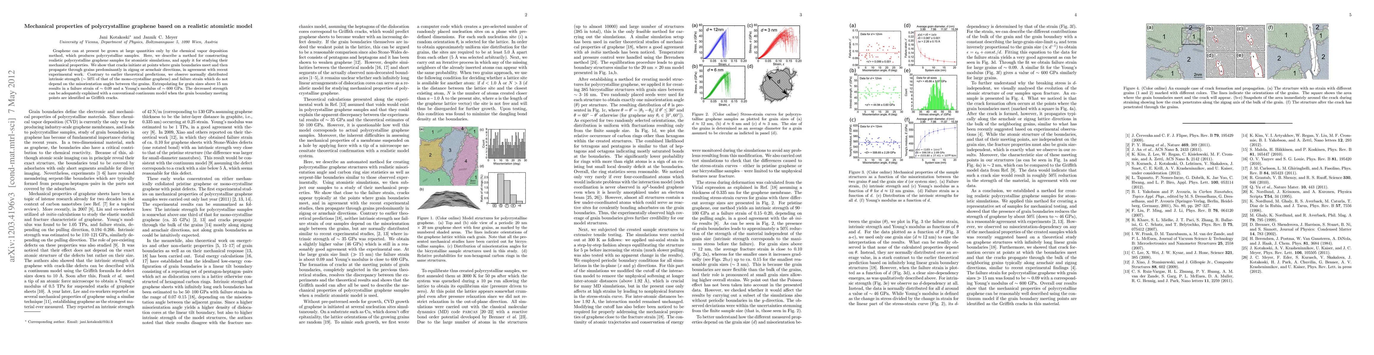 Graphene can at present be grown at large quantities only by the chemical vapor deposition method, which produces polycrystalline samples. Here, we describe a method for constructing realistic polycrystalline graphene samples for atomistic simulations, and apply it for studying their mechanical properties. We show that cracks initiate at points where grain boundaries meet and then propagate through grains predominantly in zigzag or armchair directions, in agreement with recent experimental work. Contrary to earlier theoretical predictions, we observe normally distributed intrinsic strength (~ 50% of that of the mono-crystalline graphene) and failure strain which do not depend on the misorientation angles between the grains. Extrapolating for grain sizes above 15 nm results in a failure strain of ~ 0.09 and a Young's modulus of ~ 600 GPa. The decreased strength can be adequately explained with a conventional continuum model when the grain boundary meeting points are identified as Griffith cracks.