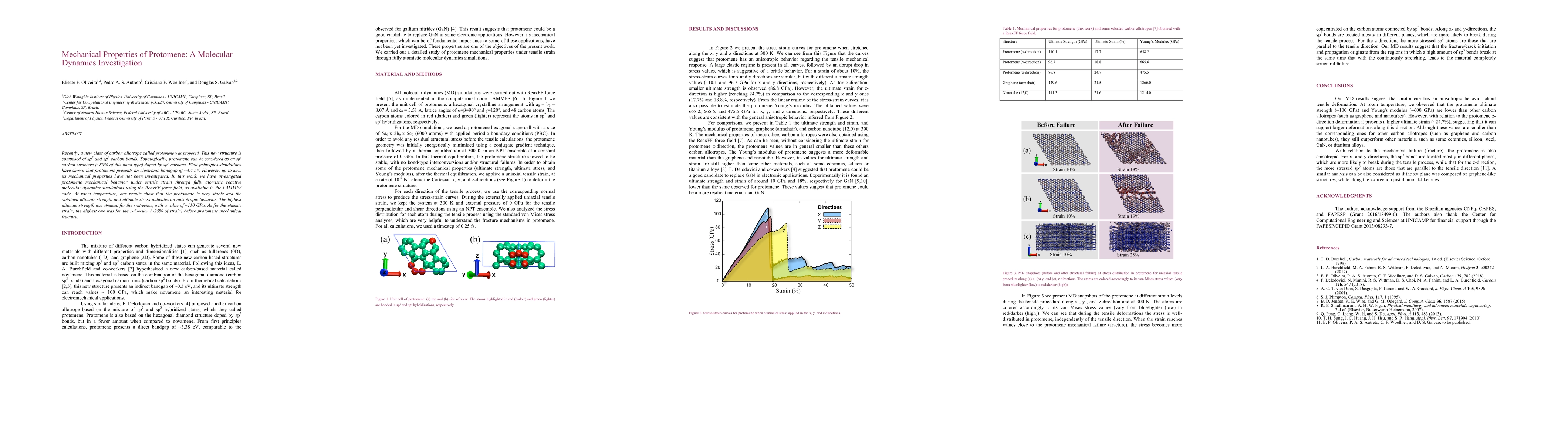 This study investigates the mechanical properties of protomene, a new carbon allotrope, using molecular dynamics simulations. The results reveal that protomene exhibits high stability, with an ultimate strength of ~110 GPa in the x-direction, and an ultimate strain of ~25% in the z-direction before fracture, indicating anisotropic mechanical behavior.