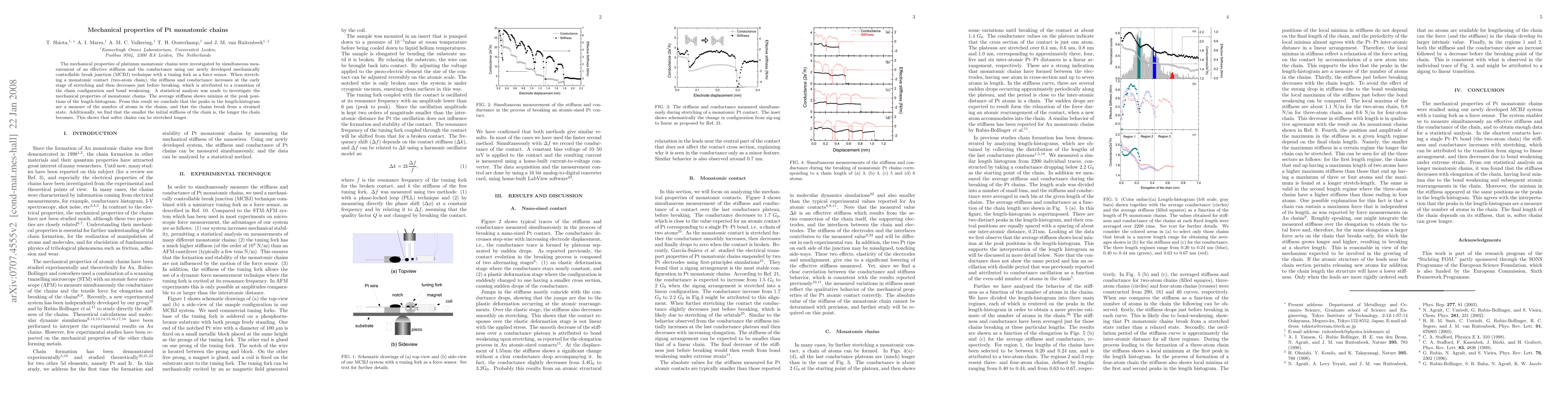The mechanical properties of Pt monatomic chains were investigated using a newly developed mechanically controllable break junction (MCBJ) technique with a tuning fork as a force sensor, enabling simultaneous measurement of effective stiffness and conductance during stretching and breaking.