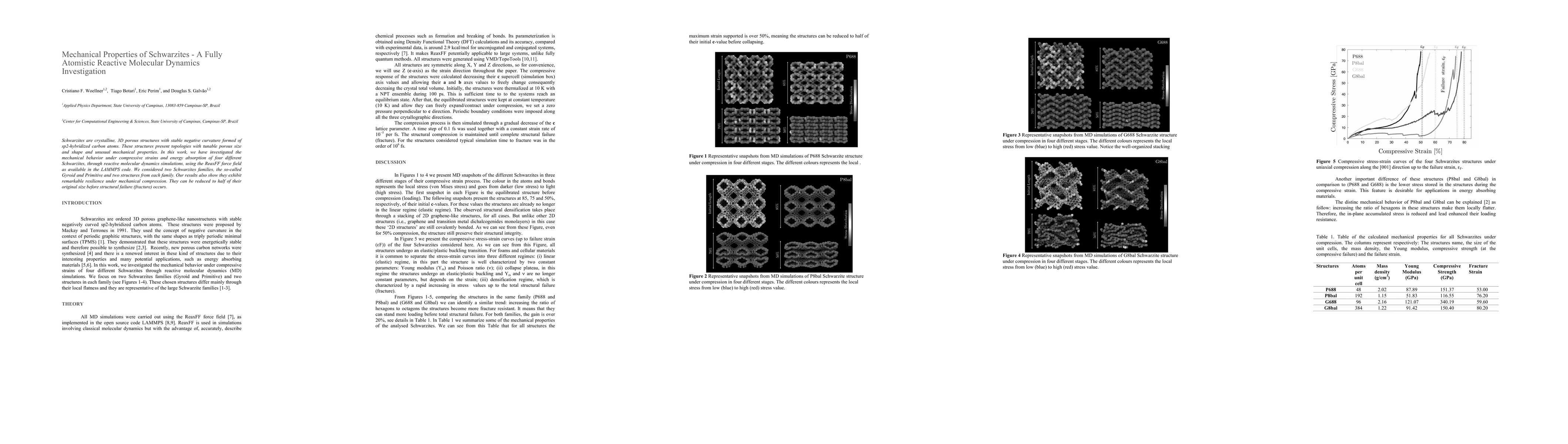 This study investigates the mechanical properties of Schwarzites, 3D porous carbon structures, via reactive molecular dynamics simulations. Results reveal exceptional resilience, with the materials sustaining compression to half their original size before structural failure.