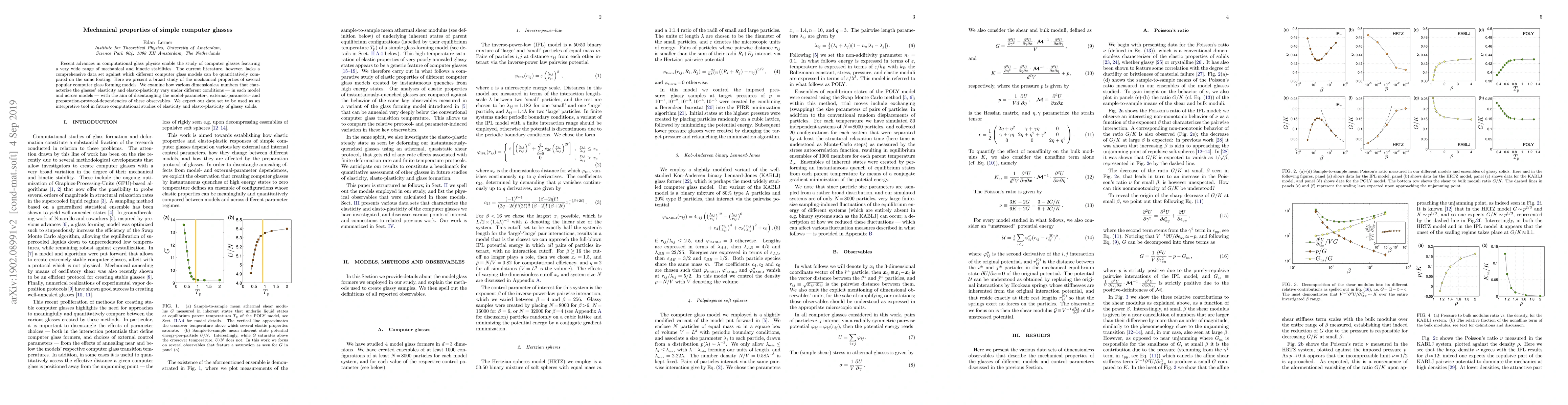 This paper presents a comprehensive study of the mechanical properties of various computer glass models, focusing on the elasticity and elasto-plasticity characterized by dimensionless numbers. The study aims to provide a comparative data set for future computational studies on glassy solids.