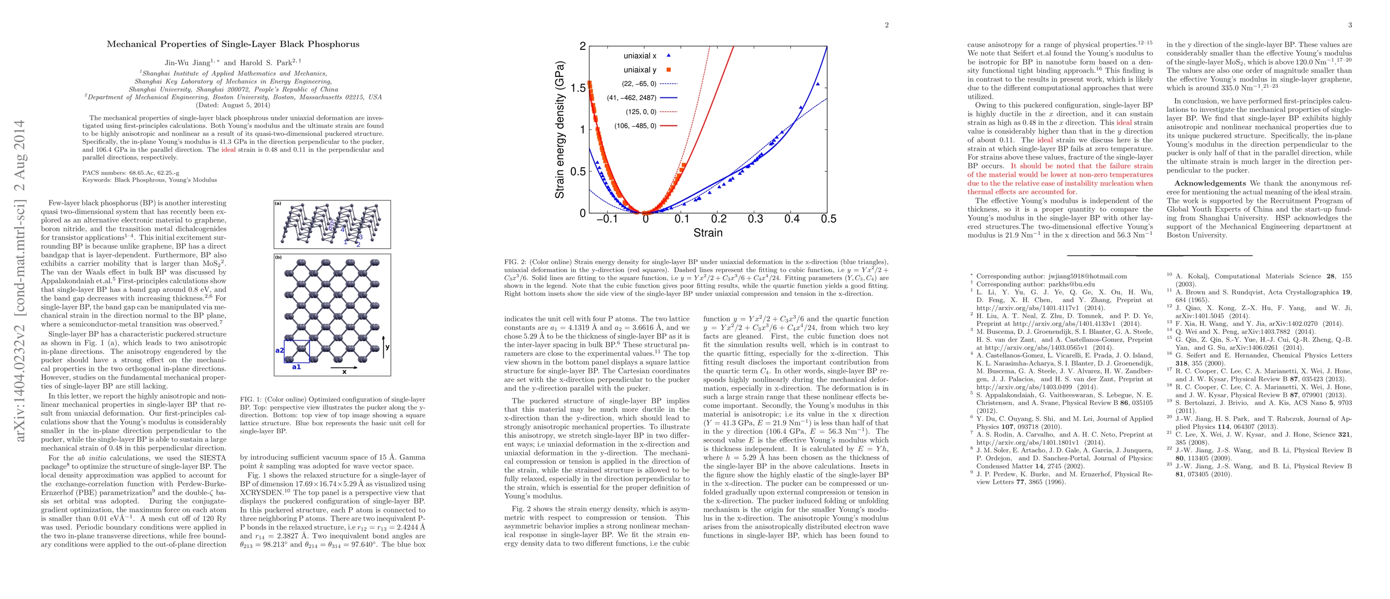 The mechanical properties of single-layer black phosphrous under uniaxial deformation are investigated using first-principles calculations. Both Young's modulus and the ultimate strain are found to be highly anisotropic and nonlinear as a result of its quasi-two-dimensional puckered structure. Specifically, the in-plane Young's modulus is 44.0 GPa in the direction perpendicular to the pucker, and 92.7 GPa in the parallel direction. The ultimate strain is 0.48 and 0.20 in the perpendicular and parallel directions, respectively.