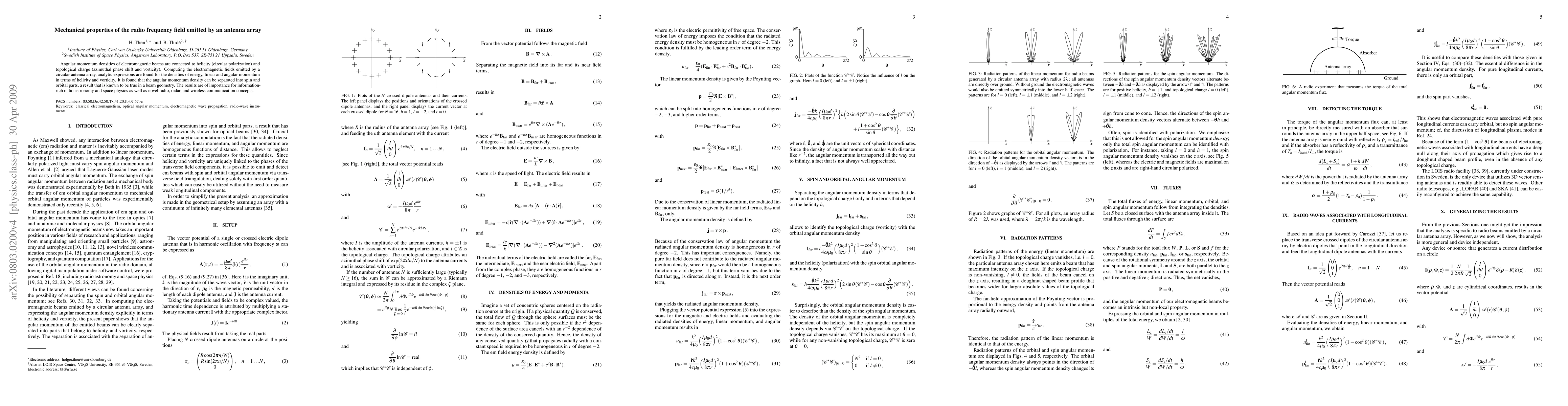 Angular momentum densities of electromagnetic beams are connected to helicity (circular polarization) and topological charge (azimuthal phase shift and vorticity). Computing the electromagnetic fields emitted by a circular antenna array, analytic expressions are found for the densities of energy, linear and angular momentum in terms of helicity and vorticity. It is found that the angular momentum density can be separated into spin and orbital parts, a result that is known to be true in a beam geometry. The results are of importance for information-rich radio astronomy and space physics as well as novel radio, radar, and wireless communication concepts.