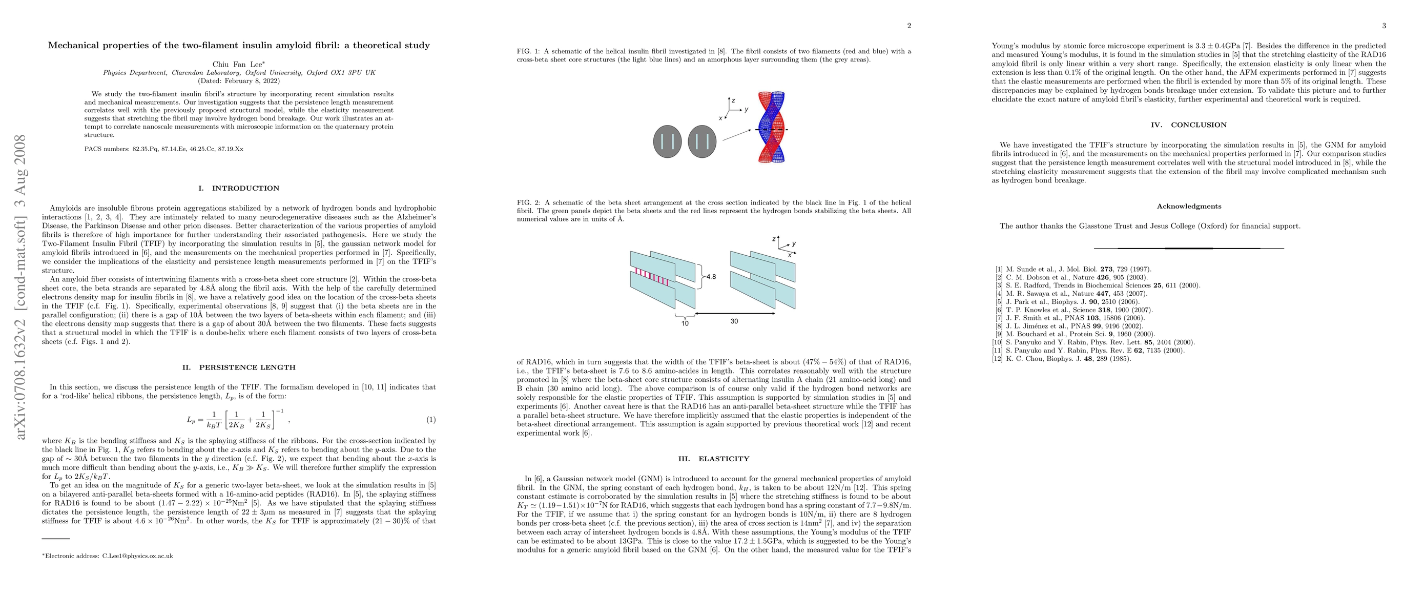 We study the two-filament insulin fibril's structure by incorporating recent simulation results and mechanical measurements. Our investigation suggests that the persistence length measurement correlates well with the previously proposed structural model, while the elasticity measurement suggests that stretching the fibril may involve hydrogen bond breakage. Our work illustrates an attempt to correlate nanoscale measurements with microscopic information on the quaternary protein structure.