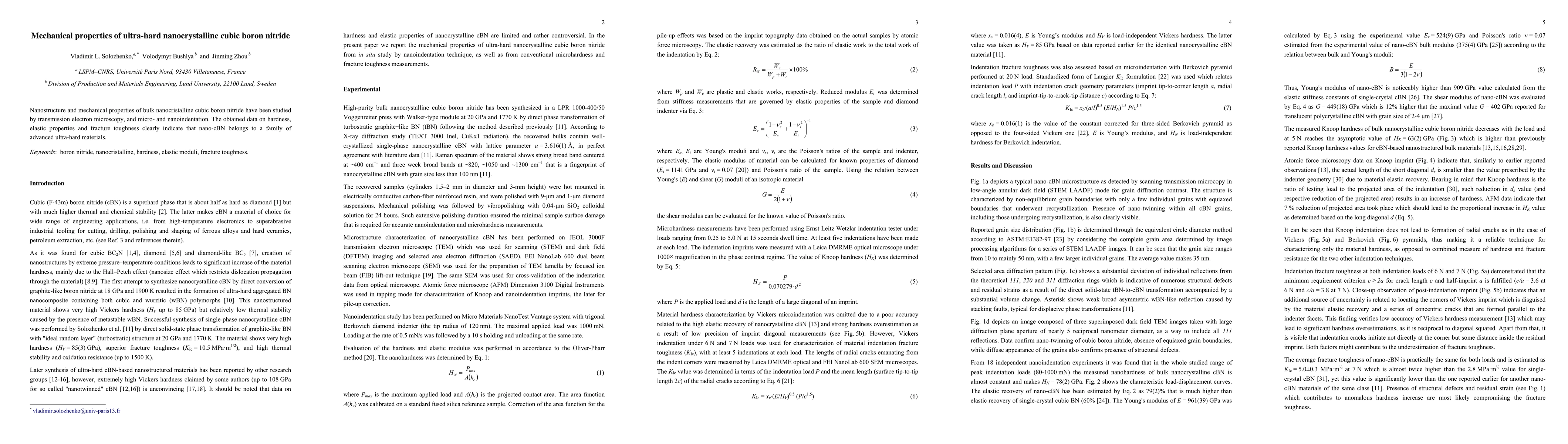 Nanostructure and mechanical properties of bulk nanocristalline cubic boron nitride were studied using transmission electron microscopy, micro- and nanoindentation.