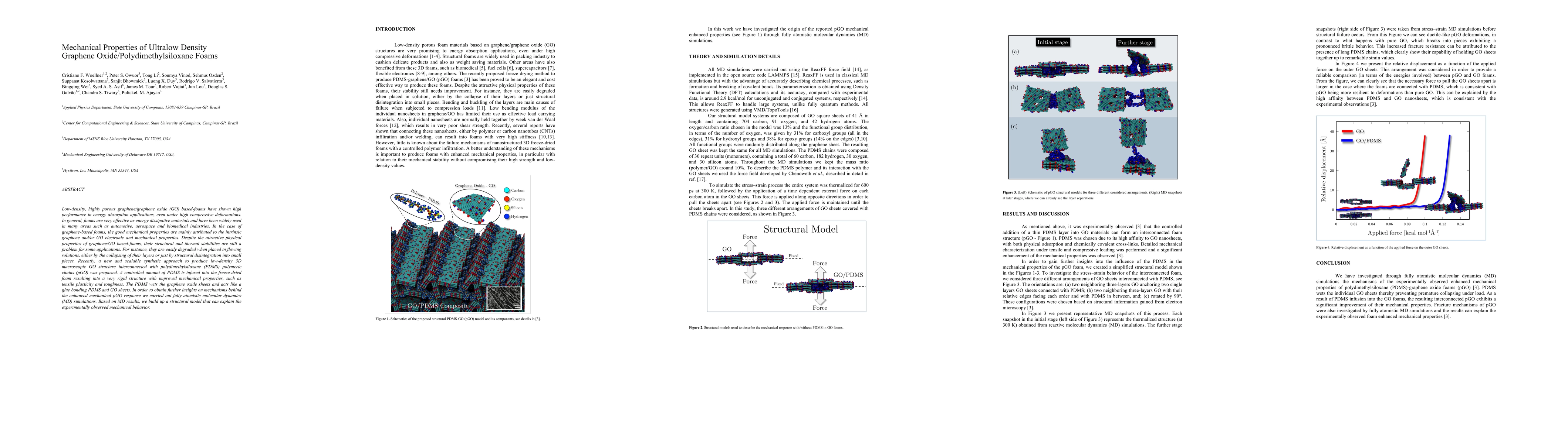 Low-density, highly porous graphene/graphene oxide (GO) based-foams have shown high performance in energy absorption applications, even under high compressive deformations. In general, foams are very effective as energy dissipative materials and have been widely used in many areas such as automotive, aerospace and biomedical industries. In the case of graphene-based foams, the good mechanical properties are mainly attributed to the intrinsic graphene and/or GO electronic and mechanical properties. Despite the attractive physical properties of graphene/GO based-foams, their structural and thermal stabilities are still a problem for some applications. For instance, they are easily degraded when placed in flowing solutions, either by the collapsing of their layers or just by structural disintegration into small pieces. Recently, a new and scalable synthetic approach to produce low-density 3D macroscopic GO structure interconnected with polydimethylsiloxane (PDMS) polymeric chains (pGO) was proposed. A controlled amount of PDMS is infused into the freeze-dried foam resulting into a very rigid structure with improved mechanical properties, such as tensile plasticity and toughness. The PDMS wets the graphene oxide sheets and acts like a glue bonding PDMS and GO sheets. In order to obtain further insights on mechanisms behind the enhanced mechanical pGO response we carried out fully atomistic molecular dynamics (MD) simulations. Based on MD results, we build up a structural model that can explain the experimentally observed mechanical behavior.