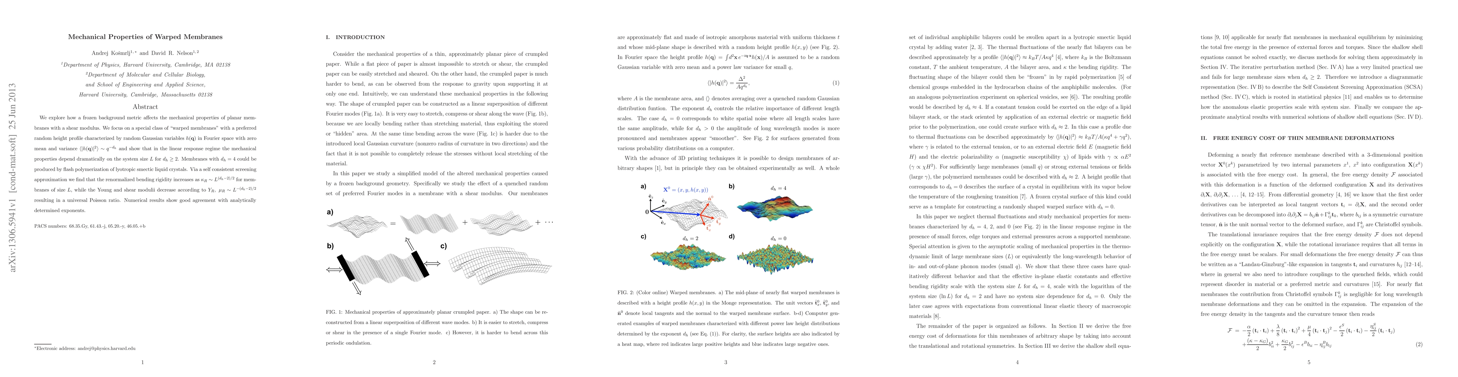 Warped membranes with a specific height profile exhibit dramatically changing mechanical properties with system size, leading to a universal Poisson ratio and improved understanding of membrane deformation.