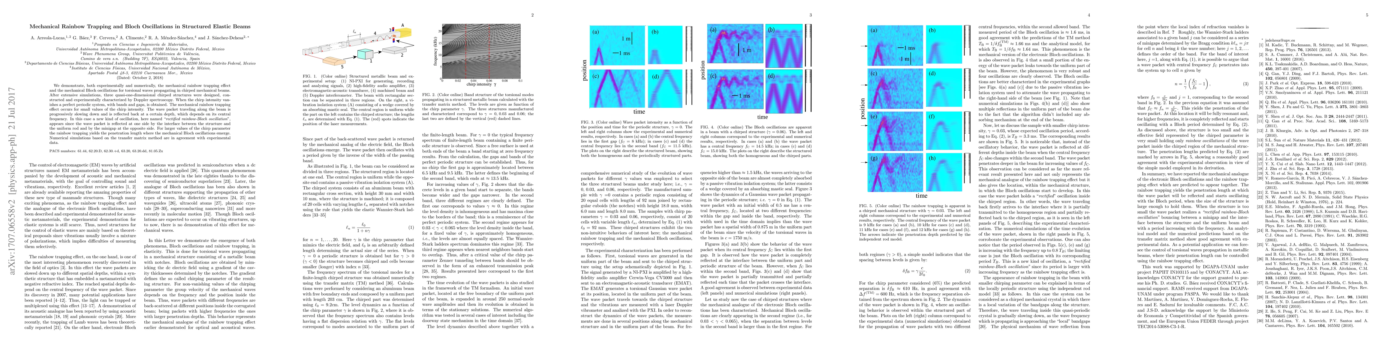 We demonstrate, both experimentally and numerically, the mechanical rainbow trapping effect and the mechanical Bloch oscillations for torsional waves propagating in chirped mechanical beams. After extensive simulations, three quasi-one-dimensional chirped structures were designed, constructed and experimentally characterized by Doppler spectroscopy. When the chirp intensity vanishes a perfect periodic system, with bands and gaps, is obtained. The mechanical rainbow trapping effect occurs for small values of the chirp intensity. The wave packet traveling along the beam is progressively slowing down and is reflected back at a certain depth, which depends on its central frequency. In this case a new kind of oscillation, here named "{\em rectified rainbow-Bloch oscillation}", appears since the wave packet is reflected at one side by the interface between the structure and the uniform rod and by the minigap at the opposite side. For larger values of the chirp parameter the rainbow trapping yields the penetration length where the mechanical Bloch oscillations emerge. Numerical simulations based on the transfer matrix method are in agreement with experimental data.