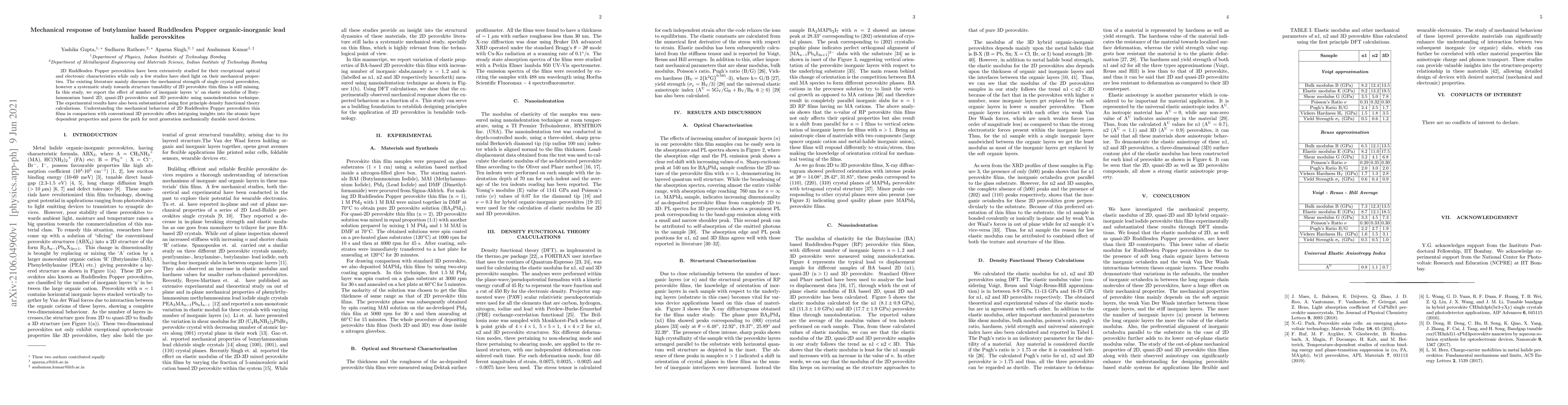 This study investigates the mechanical response of Butylammonium based Ruddlesden Popper perovskites, focusing on the elastic modulus of 2D and quasi-2D perovskites compared to 3D perovskites using nanoindentation and density functional theory. The findings provide insights into the atomic layer dependent mechanical properties, which are crucial for developing durable next-generation devices.