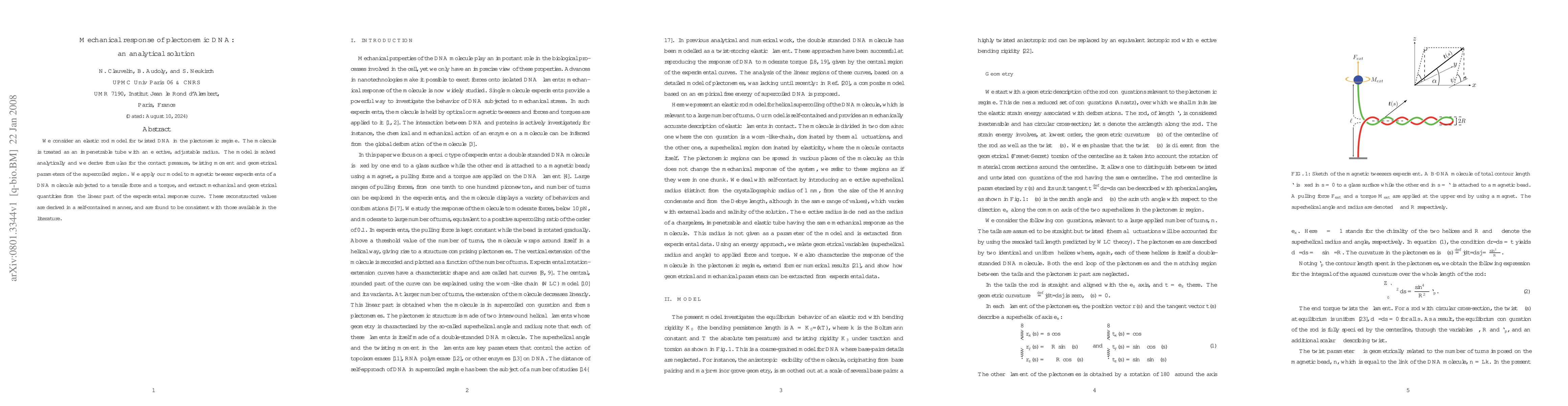 This paper provides an analytical solution for the mechanical response of plectonemic DNA using an elastic rod model, deriving formulas for contact pressure, twisting moment, and geometrical parameters. The model's predictions are validated against magnetic tweezer experiments, showing consistency with existing literature.