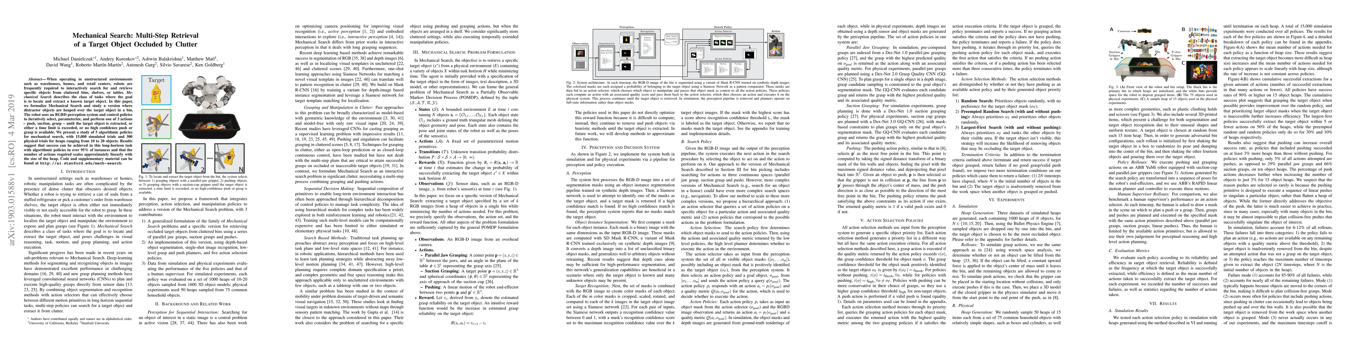 This paper introduces Mechanical Search, a framework for robots to locate and retrieve target objects from cluttered bins using RGBD perception and control policies. The study, involving 15,000 simulated and 300 physical trials, shows that algorithmic policies can successfully extract target objects in over 95% of cases, with the number of actions scaling linearly with heap size.