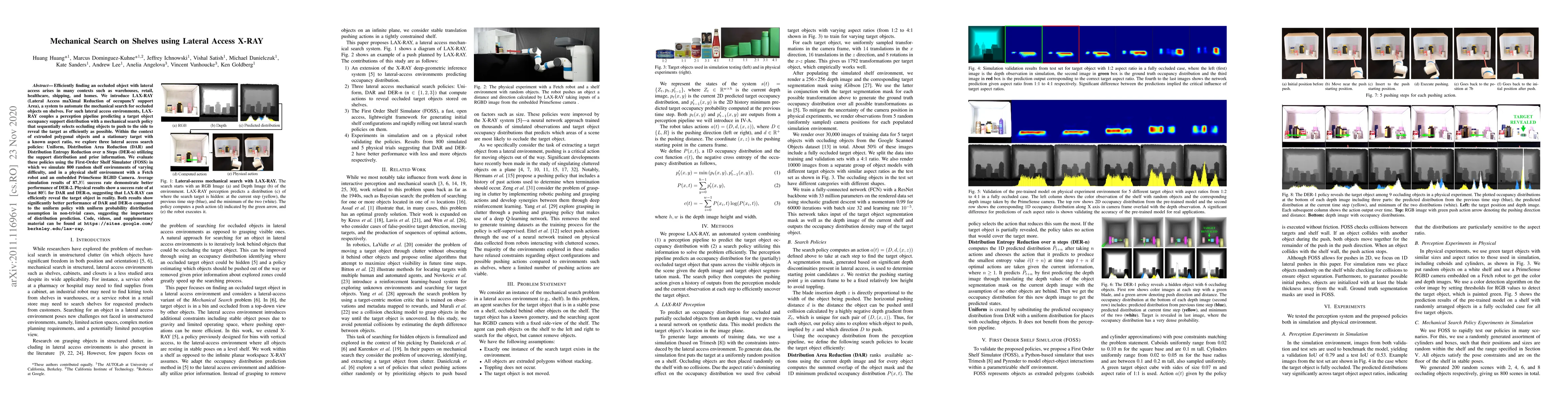 Efficiently finding an occluded object with lateral access arises in many contexts such as warehouses, retail, healthcare, shipping, and homes. We introduce LAX-RAY (Lateral Access maXimal Reduction of occupancY support Area), a system to automate the mechanical search for occluded objects on shelves. For such lateral access environments, LAX-RAY couples a perception pipeline predicting a target object occupancy support distribution with a mechanical search policy that sequentially selects occluding objects to push to the side to reveal the target as efficiently as possible. Within the context of extruded polygonal objects and a stationary target with a known aspect ratio, we explore three lateral access search policies: Distribution Area Reduction (DAR), Distribution Entropy Reduction (DER), and Distribution Entropy Reduction over Multiple Time Steps (DER-MT) utilizing the support distribution and prior information. We evaluate these policies using the First-Order Shelf Simulator (FOSS) in which we simulate 800 random shelf environments of varying difficulty, and in a physical shelf environment with a Fetch robot and an embedded PrimeSense RGBD Camera. Average simulation results of 87.3% success rate demonstrate better performance of DER-MT with 2 prediction steps. When deployed on the robot, results show a success rate of at least 80% for all policies, suggesting that LAX-RAY can efficiently reveal the target object in reality. Both results show significantly better performance of the three proposed policies compared to a baseline policy with uniform probability distribution assumption in non-trivial cases, showing the importance of distribution prediction. Code, videos, and supplementary material can be found at https://sites.google.com/berkeley.edu/lax-ray.
