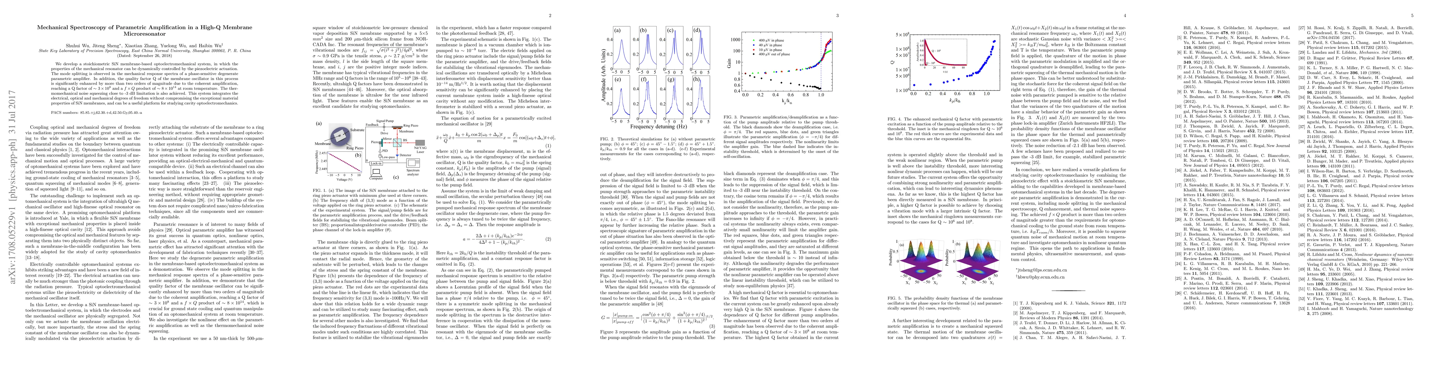 We develop a stoichiometric SiN membrane-based optoelectromechanical system, in which the properties of the mechanical resonator can be dynamically controlled by the piezoelectric actuation. The mode splitting is observed in the mechanical response spectra of a phase-sensitive degenerate parametric amplifier. In addition, the quality factor Q of the membrane oscillator in this process is signicantly enhanced by more than two orders of magnitude due to the coherent amplication, reaching a Q factor of ~ 3*10^8 and a f*Q product of ~ 8*10^14 at room temperature. The thermomechanical noise squeezing close to -3 dB limitation is also achieved. This system integrates the electrical, optical and mechanical degrees of freedom without compromising the exceptional material properties of SiN membranes, and can be a useful platform for studying cavity optoelectromechanics.
