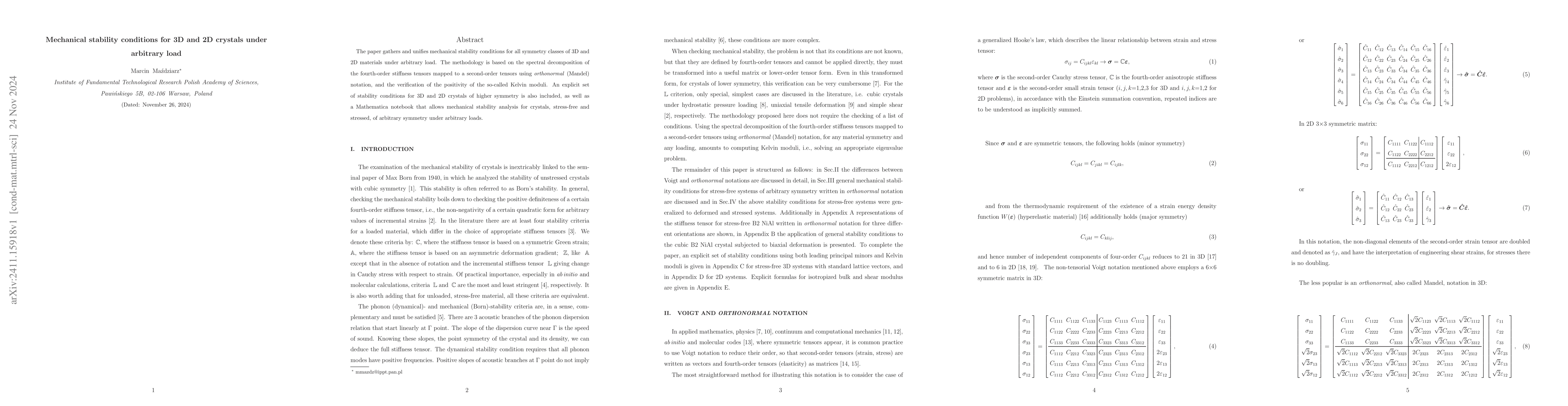 The paper presents a comprehensive set of stability conditions and a computational tool for analyzing mechanical stability in 3D and 2D crystals under arbitrary loads.