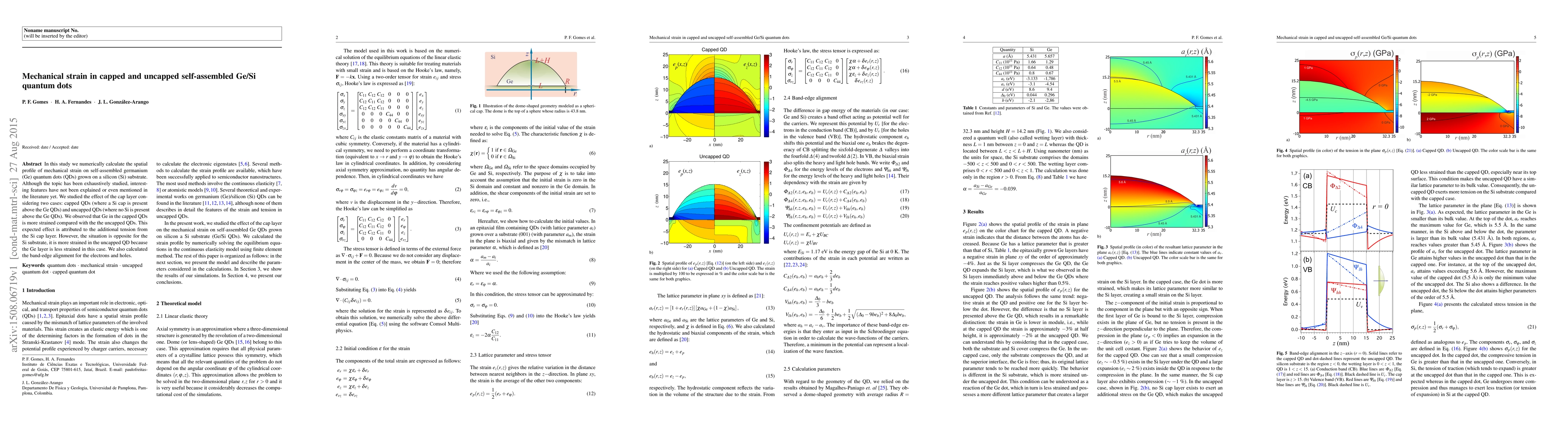 In this study we numerically calculate the spatial profile of mechanical strain on self-assembled germanium (Ge) quantum dots (QDs) grown on a silicon (Si) substrate. Although the topic has been exhaustively studied, interesting features have not been explained or even mentioned in the literature yet. We studied the effect of the cap layer considering two cases: capped QDs (where a Si cap is present above the Ge QDs) and uncapped QDs (where no Si is present above the Ge QDs). We observed that Ge in the capped QDs is more strained compared with the the uncapped QDs. This expected effect is attributed to the additional tension from the Si cap layer. However, the situation is opposite for the Si substrate, it is more strained in the uncapped QD because the Ge layer is less strained in this case. We also calculated the band-edge alignment for the electrons and holes.