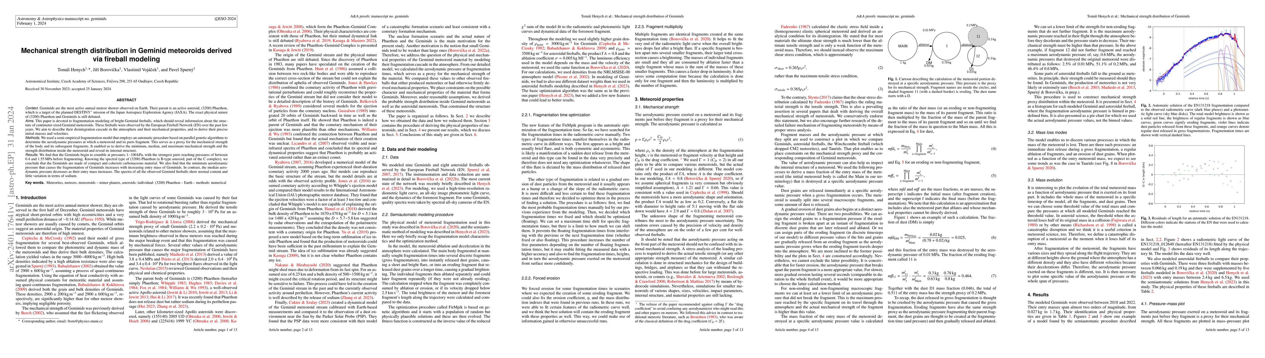 This study uses fireball modeling to analyze the mechanical strength distribution of Geminid meteoroids, revealing their disintegration in Earth's atmosphere. The research finds that Geminids start fragmenting at pressures between 1-100 kPa, with the strongest parts fragmenting at 0.4-1.55 MPa, indicating they are composed of compact carbonaceous material.