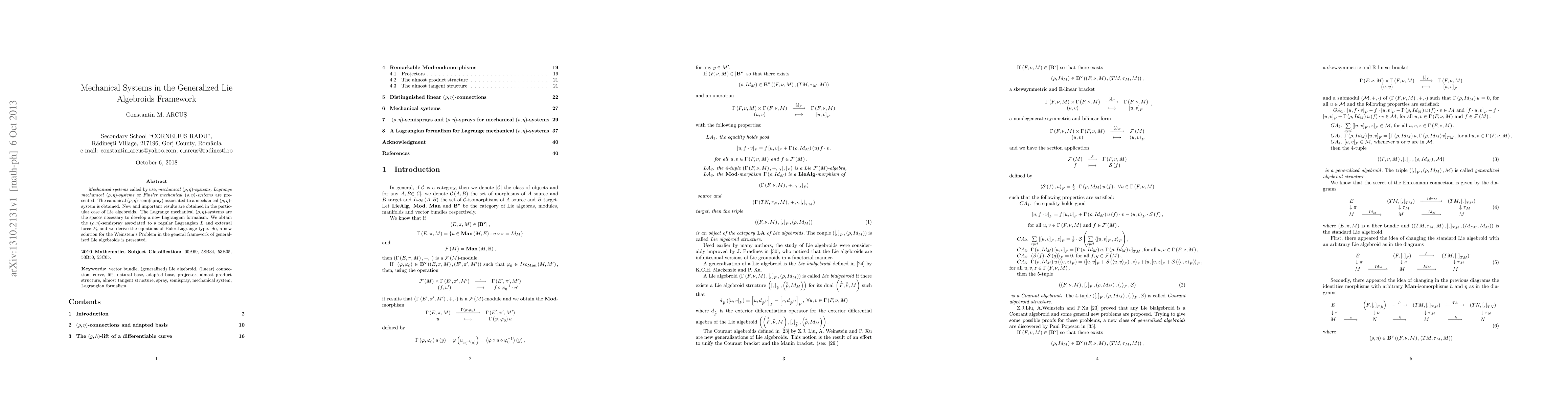 \emph{Mechanical systems} called by use, \emph{mechanical}$\left(\rho ,\eta\right) $\emph{-systems, Lagrange mechanical}$\left(\rho ,\eta \right) $\emph{-systems} or \emph{Finsler mechanical}$\left(\rho ,\eta \right) $\emph{-systems} are presented. The canonical $\left(\rho ,\eta \right) $\emph{-}semi(spray) associated to a mechanical $\left(\rho ,\eta \right) $-system is obtained. New and important results are obtained in the particular case of Lie algebroids. The Lagrange mechanical $(\rho ,\eta)$% -systems are the spaces necessary to develop a new Lagrangian formalism. We obtain the $(\rho ,\eta)$-semispray associated to a regular Lagrangian $L$ and external force $F_{e}$ and we derive the equations of Euler-Lagrange type. So, a new solution for the Weinstein's Problem in the general framework of generalized Lie algebroids is presented.