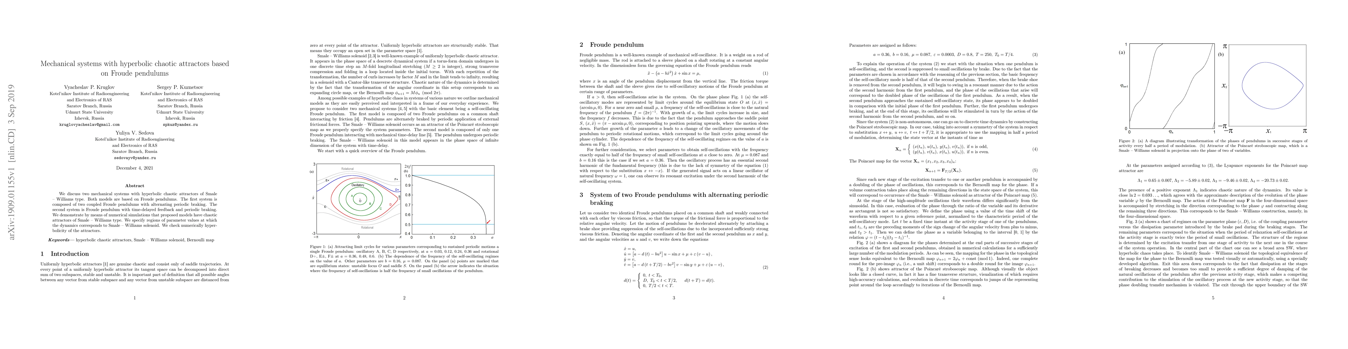 This paper investigates two mechanical systems based on Froude pendulums that exhibit hyperbolic chaotic attractors of Smale-Williams type, demonstrated through numerical simulations. The models include coupled pendulums with alternating periodic braking and a pendulum with time-delayed feedback and periodic braking, both showing dynamics corresponding to Smale-Williams solenoids.