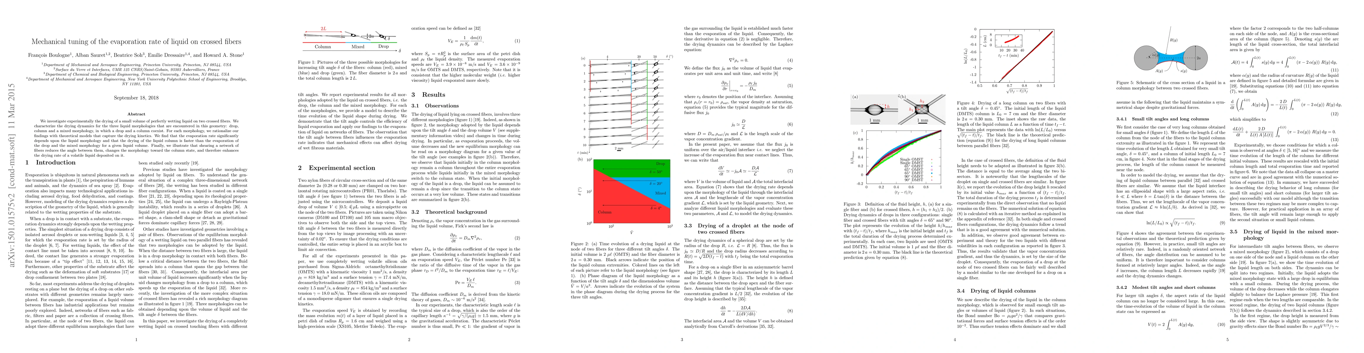 This study experimentally investigates the drying dynamics of a wetting liquid on two crossed fibers, characterizing three morphologies: drop, column, and mixed. Theoretical models show that the evaporation rate is significantly influenced by the liquid morphology, with the liquid column drying faster than drops or mixed states. Shearing the fiber network enhances drying by reducing fiber angles and favoring columnar morphology.