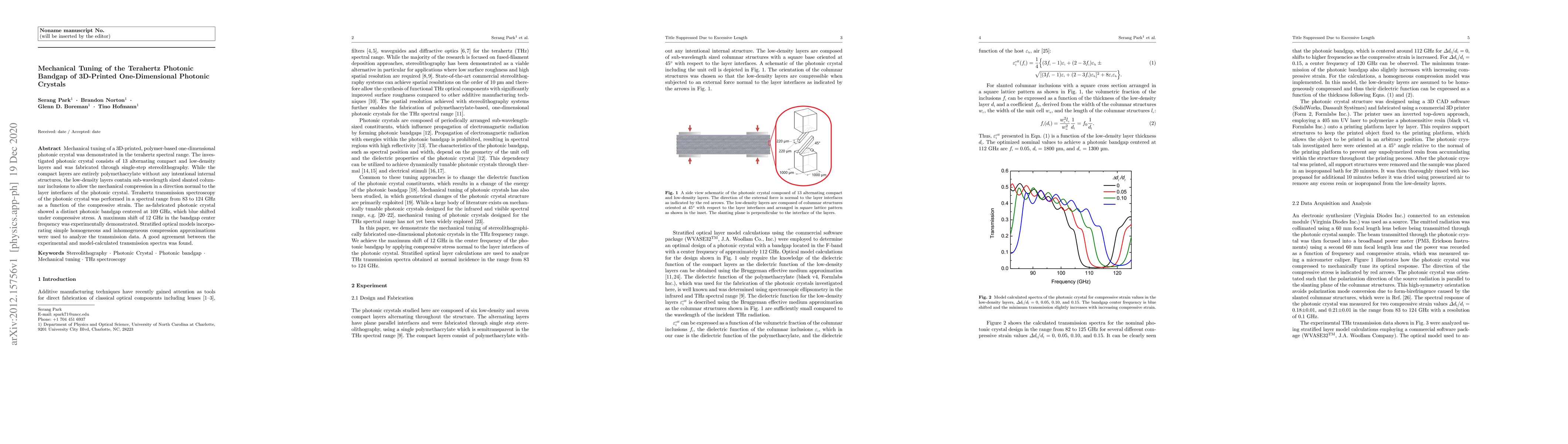 This paper demonstrates mechanical tuning of a 3D-printed, polymer-based one-dimensional photonic crystal in the terahertz range, showing a photonic bandgap that blue shifts under compressive strain, with a maximum shift of 12 GHz. The crystal's structure allows for effective mechanical compression, validated by good agreement between experimental and theoretical transmission spectra.