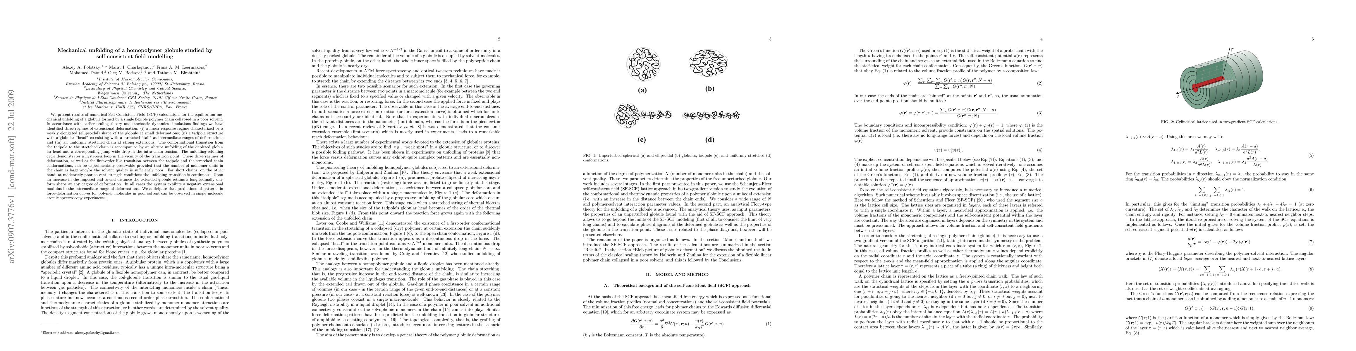 This paper uses self-consistent field modelling to study the mechanical unfolding of polymer globules in poor solvents, identifying three deformation regimes: linear response, tadpole structure, and uniform stretching. The transition from the tadpole to the stretched form shows a first-order transition with hysteresis, potentially observable in experiments.