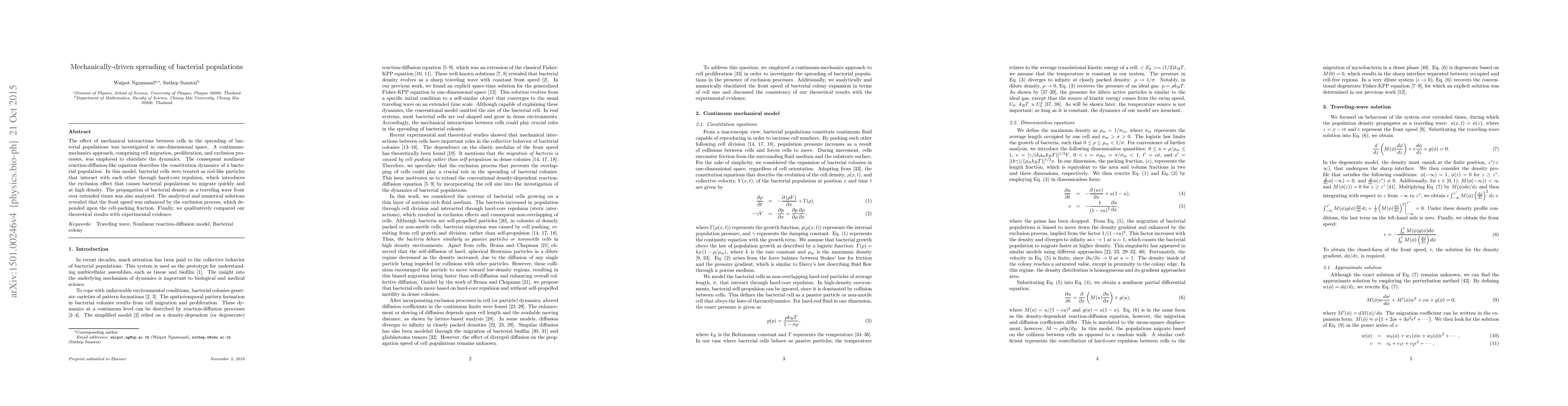 The effect of mechanical interactions between cells in the spreading of bacterial populations was investigated in one-dimensional space. A continuum-mechanics approach, comprising cell migration, proliferation, and exclusion processes, was employed to elucidate the dynamics. The consequent nonlinear reaction-diffusion-like equation describes the constitution dynamics of a bacterial population. In this model, bacterial cells were treated as rod-like particles that interact with each other through hard-core repulsion, which introduces the exclusion effect that causes bacterial populations to migrate quickly and at high density. The propagation of bacterial density as a traveling wave front over extended times was also analysed. The analytical and numerical solutions revealed that the front speed was enhanced by the exclusion process, which depended upon the cell-packing fraction. Finally, we qualitatively compared our theoretical results with experimental evidence.