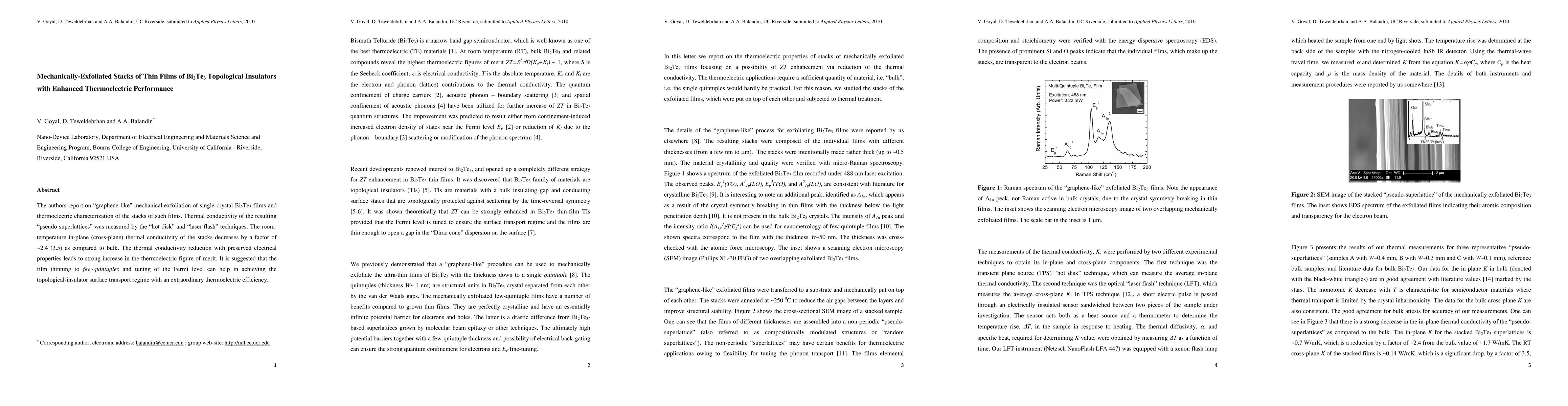 This paper explores the mechanical exfoliation of single-crystal Bi2Te3 films to create "pseudo-superlattices" with significantly reduced thermal conductivity, leading to enhanced thermoelectric performance and a notable increase in the thermoelectric figure of merit. The study suggests that thinning the films and tuning the Fermi level may achieve superior thermoelectric efficiency.
