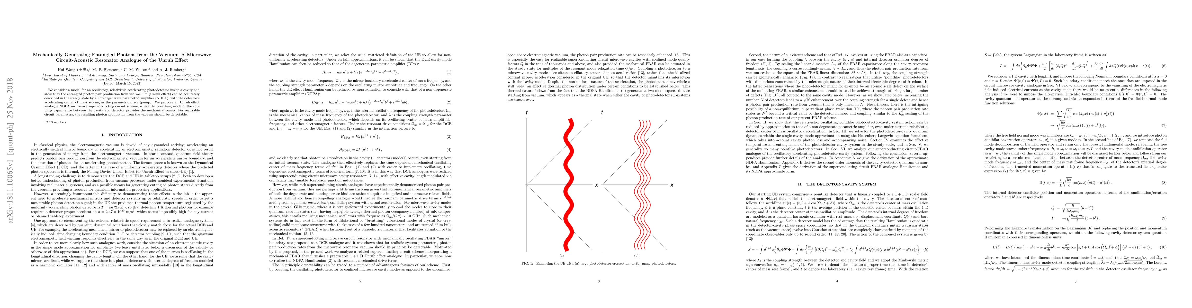 This paper proposes a microwave circuit analogue to the Unruh effect, where an oscillatory accelerating photodetector generates entangled photon pairs from the vacuum. The model uses a non-degenerate parametric amplifier driven by the mechanical pump from the coupling capacitance's breathing mode, suggesting detectable vacuum photon production.