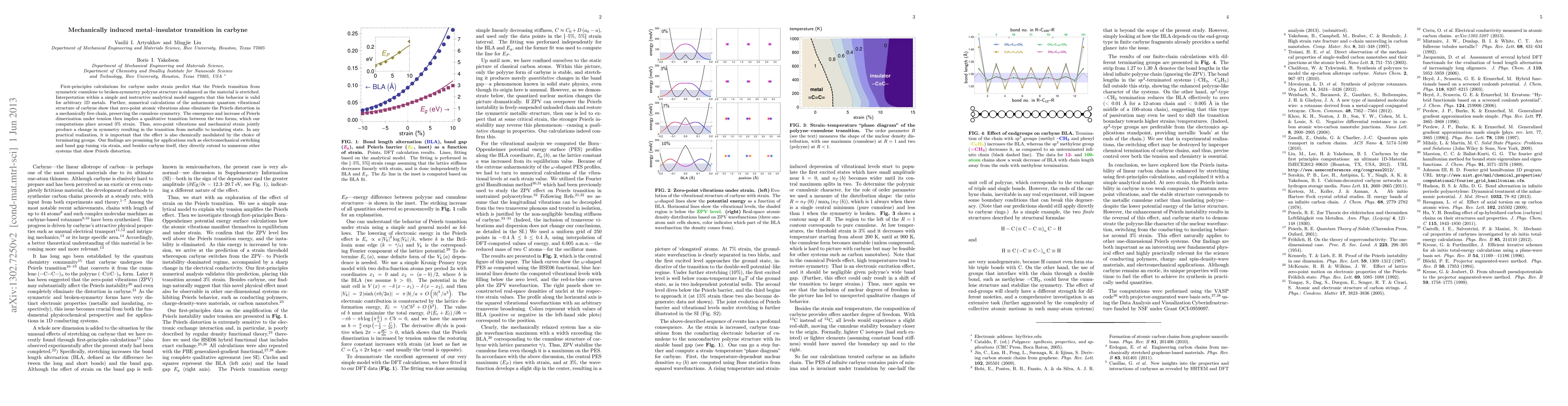 First-principles calculations for carbyne under strain predict that the Peierls transition from symmetric cumulene to broken-symmetry polyyne structure is enhanced as the material is stretched. Interpretation within a simple and instructive analytical model suggests that this behavior is valid for arbitrary 1D metals. Further, numerical calculations of the anharmonic quantum vibrational structure of carbyne show that zero-point atomic vibrations alone eliminate the Peierls distortion in a mechanically free chain, preserving the cumulene symmetry. The emergence and increase of Peierls dimerization under tension then implies a qualitative transition between the two forms, which our computations place around 3% strain. Thus, zero-point vibrations and mechanical strain jointly produce a change in symmetry resulting in the transition from metallic to insulating state. In any practical realization, it is important that the effect is also chemically modulated by the choice of terminating groups. Our findings are promising for applications such as electromechanical switching and band gap tuning via strain, and besides carbyne itself, they directly extend to numerous other systems that show Peierls distortion.