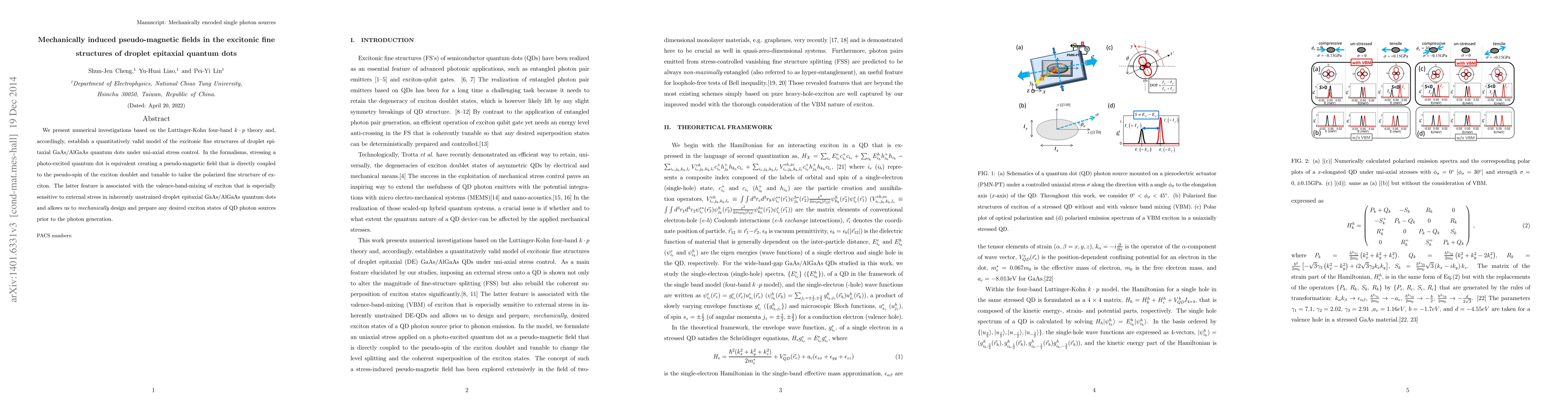 This paper investigates how uni-axial stress can induce pseudo-magnetic fields in the excitonic fine structures of droplet epitaxial GaAs/AlGaAs quantum dots, using Luttinger-Kohn four-band $k\cdot p$ theory. The study reveals that mechanical stress can be used to tailor the polarized fine structure of excitons by directly coupling to their pseudo-spin, enabling the design of desired exciton states in quantum dot photon sources.
