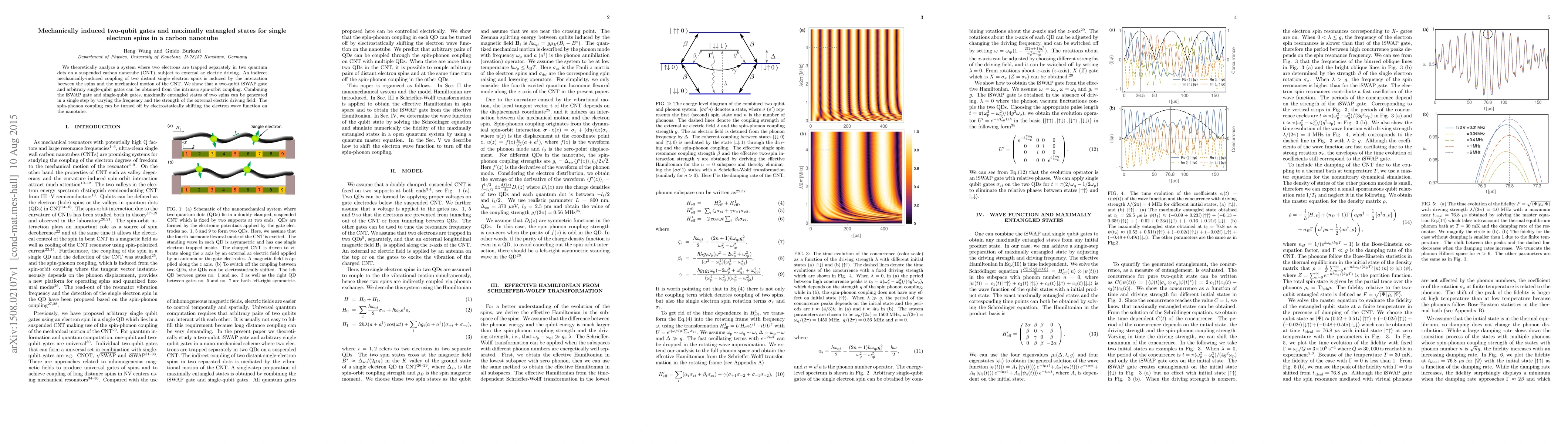 This paper explores a theoretical framework for generating two-qubit gates and maximally entangled states using single electron spins in quantum dots on a suspended carbon nanotube, driven by external ac electric fields. The system utilizes mechanically-induced coupling via spin-orbit interaction to achieve an iSWAP gate and single-qubit operations, enabling the creation of entangled states through precise control of driving parameters.