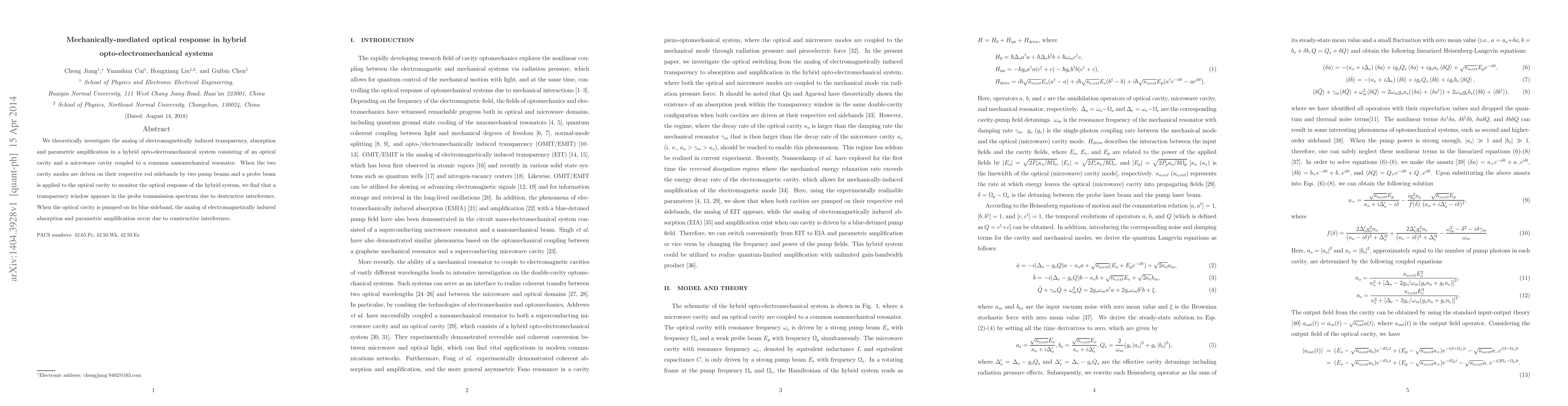 This study explores the optical phenomena analogous to electromagnetically induced transparency, absorption, and parametric amplification in a hybrid opto-electromechanical system. The system reveals a transparency window when driven on the red sidebands, while blue sideband pumping induces absorption and amplification due to constructive interference.